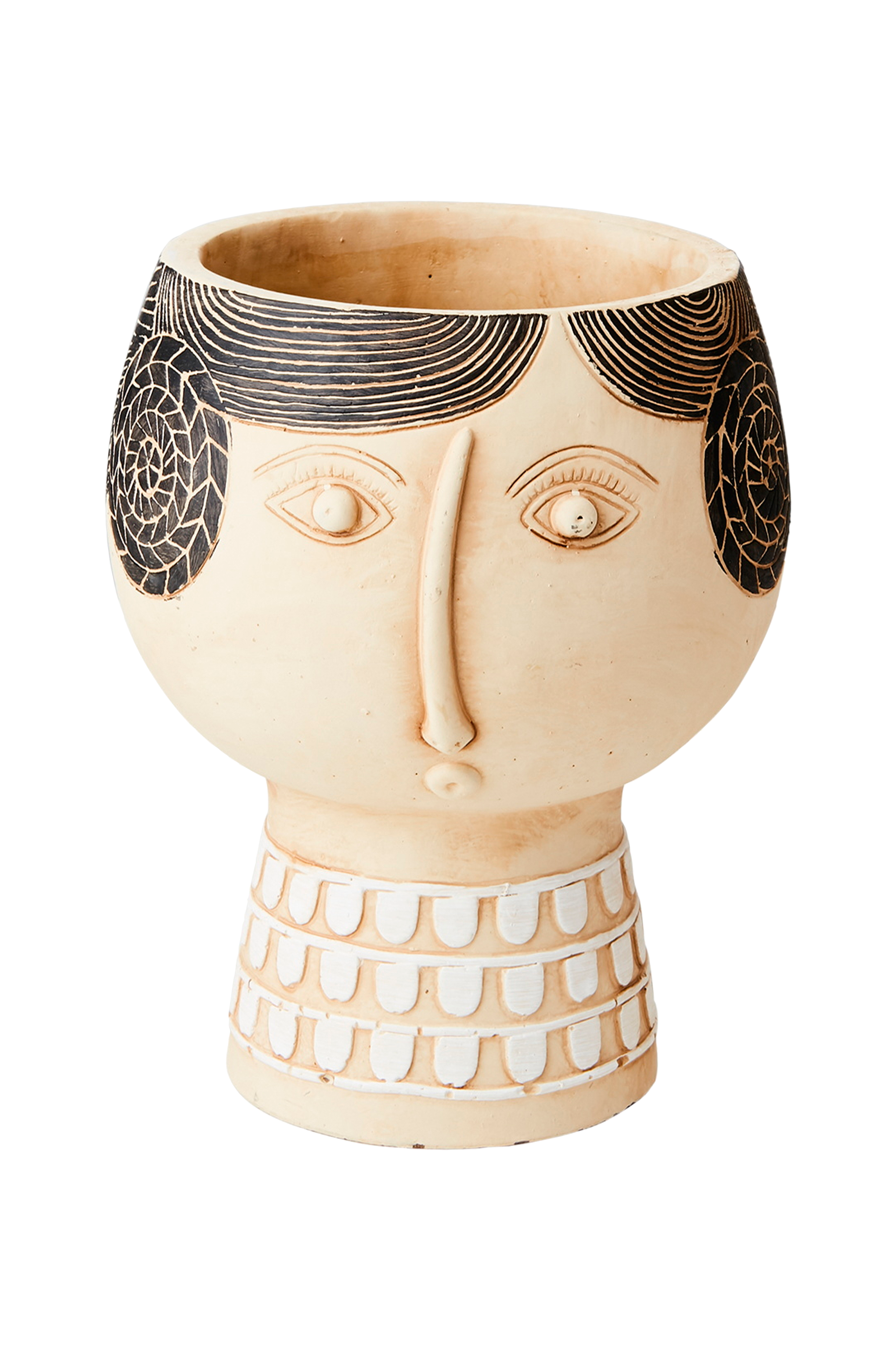 Beigen värinen betoniruukku, jossa on paljon persoonallisuutta, koska siinä on kauniit kasvot. Beige ja musta.