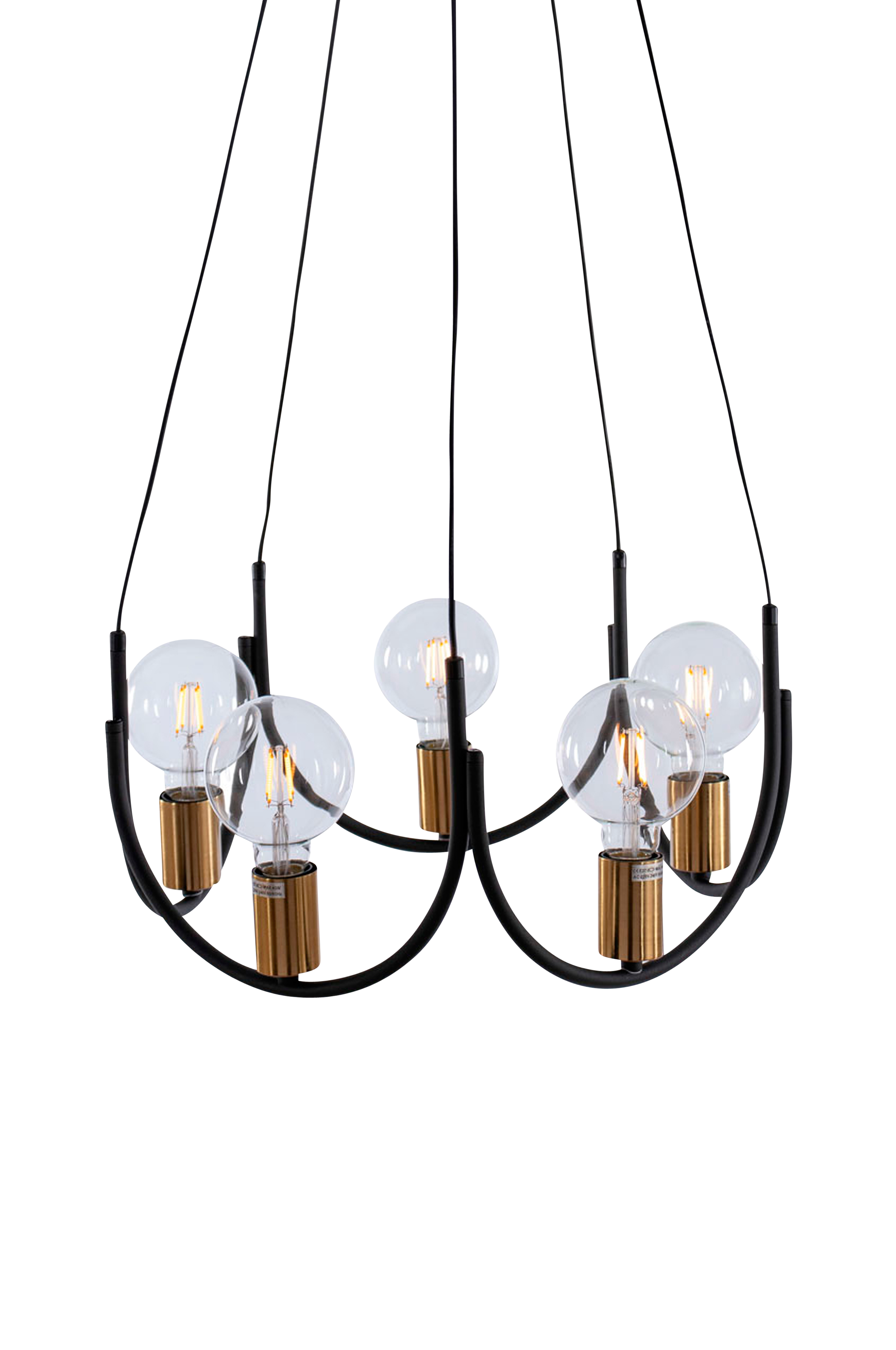 Swing-kattovalaisin mustaa rautaa ja messinkiä. Viisi valonlähdettä. Halkaisija 60 cm, korkeus 120 cm. Valaisimen korkeutta voidaan säätää. Johdon pituus 75 cm. Lampunkanta E27. Enintään 40 W. Valonlähteet eivät sisälly toimitukseen.