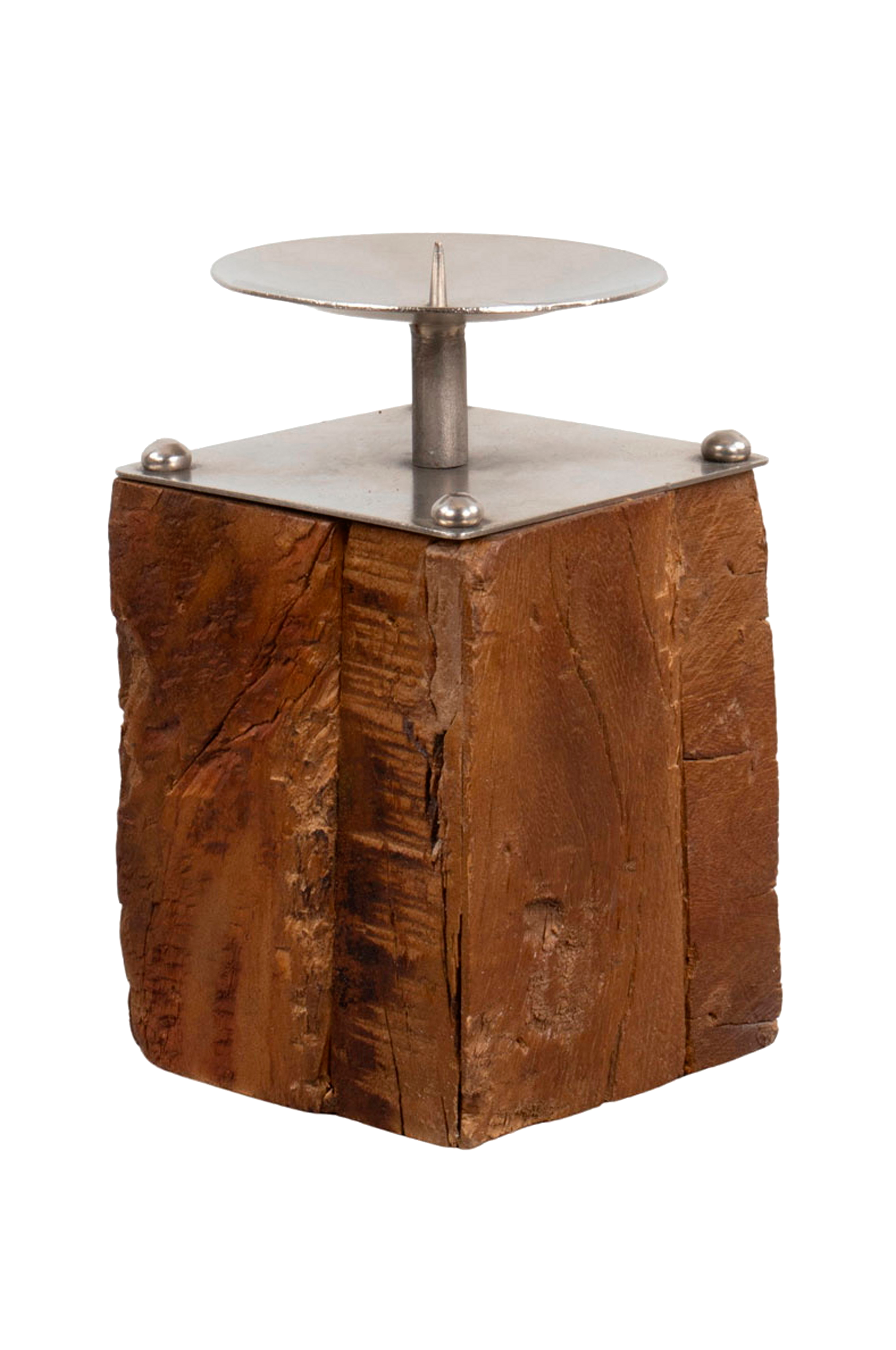 Puinen kynttilänjalka, kynttilänpidike ja alusta rautaa.