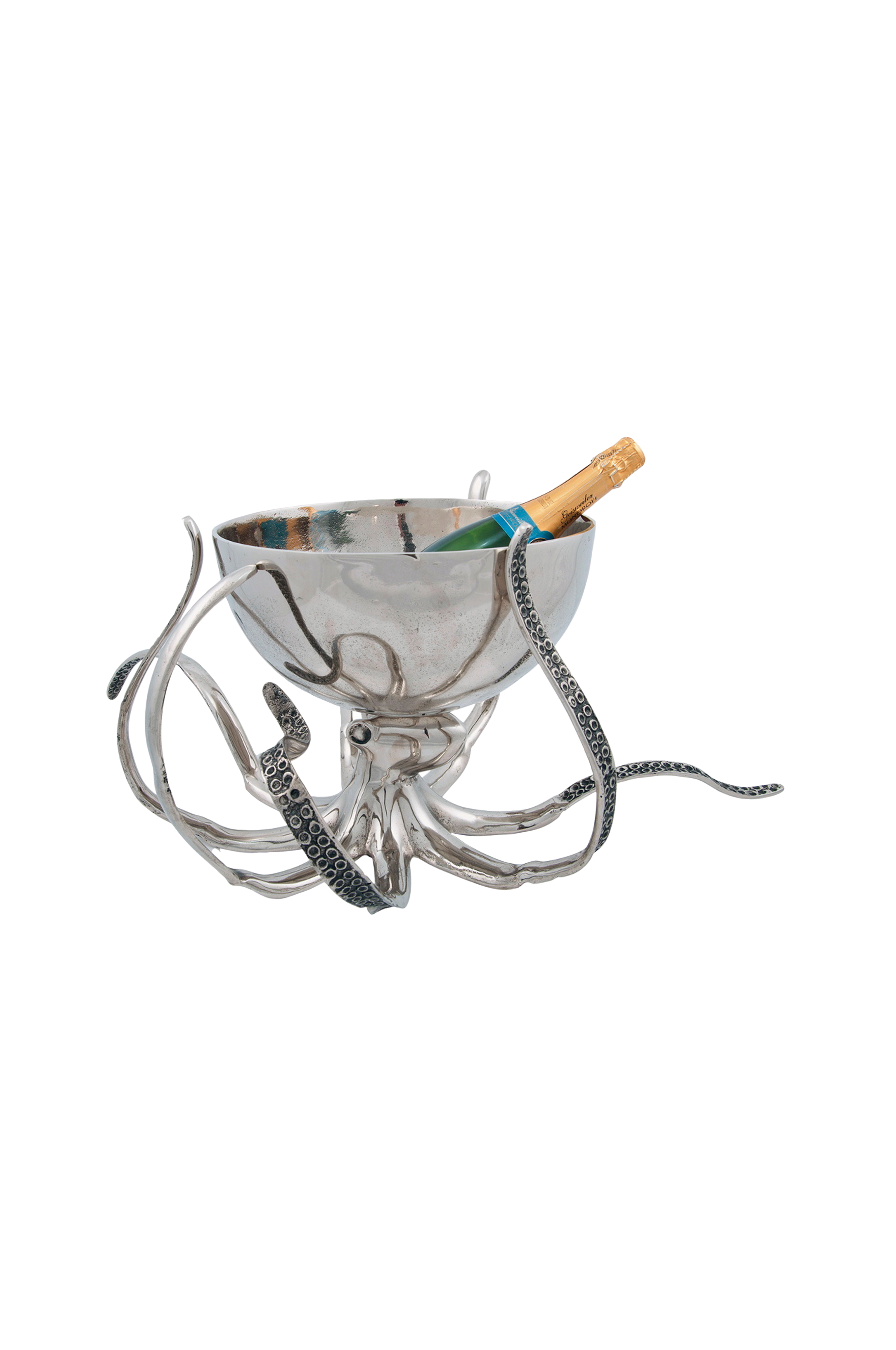 Alumiinista valmistettu hopeanvärinen samppanjajäähdytin on erittäin ylellinen ja elegantti. Jäähdyttimen pohjassa on ainutlaatuisia ja kiehtovia mustekalan lonkeroita. Käytännöllinen samppanjajäähdytin pitää samppanjasi viileänä. Se on myös taiteellinen luomus, joka on varma katseenvangitsija seuraavissa juhlissasi.