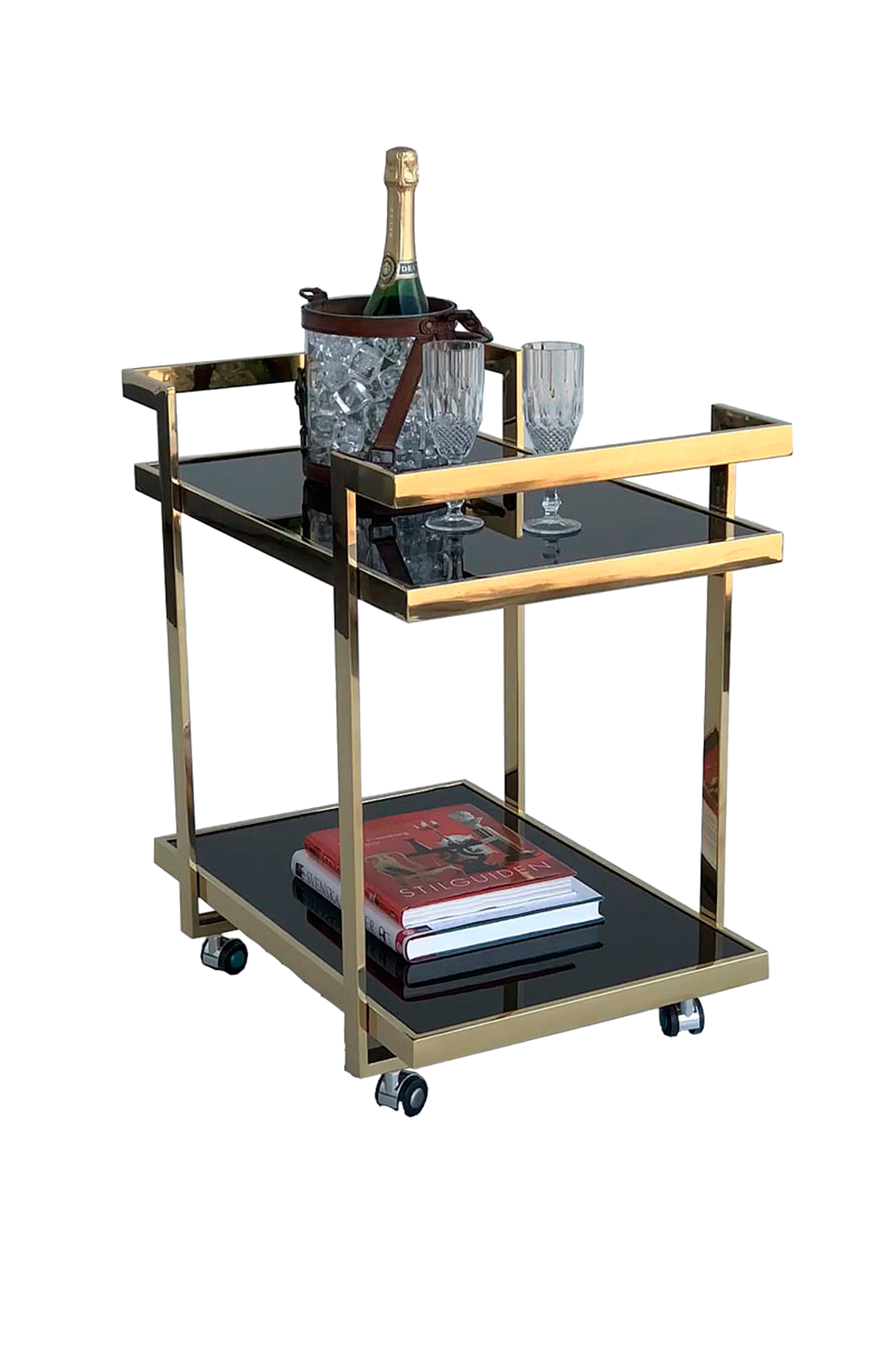 Tutustu eleganssin ja kontrastin yhdistelmään upeassa messinginvärisessä tarjoiluvaunussa, joka on valmistettu ruostumattomasta teräksestä ja vahvasta karkaistusta mustasta lasista. Hanki tarjoiluvaunu kotiisi saadaksesi tyylikkään ja toiminnallisen tarjoilupisteen. Tee siitä keskeinen osa sisustusta, ja anna sen heijastaa rakkauttasi muotoiluun ja vieraanvaraisuuteen.