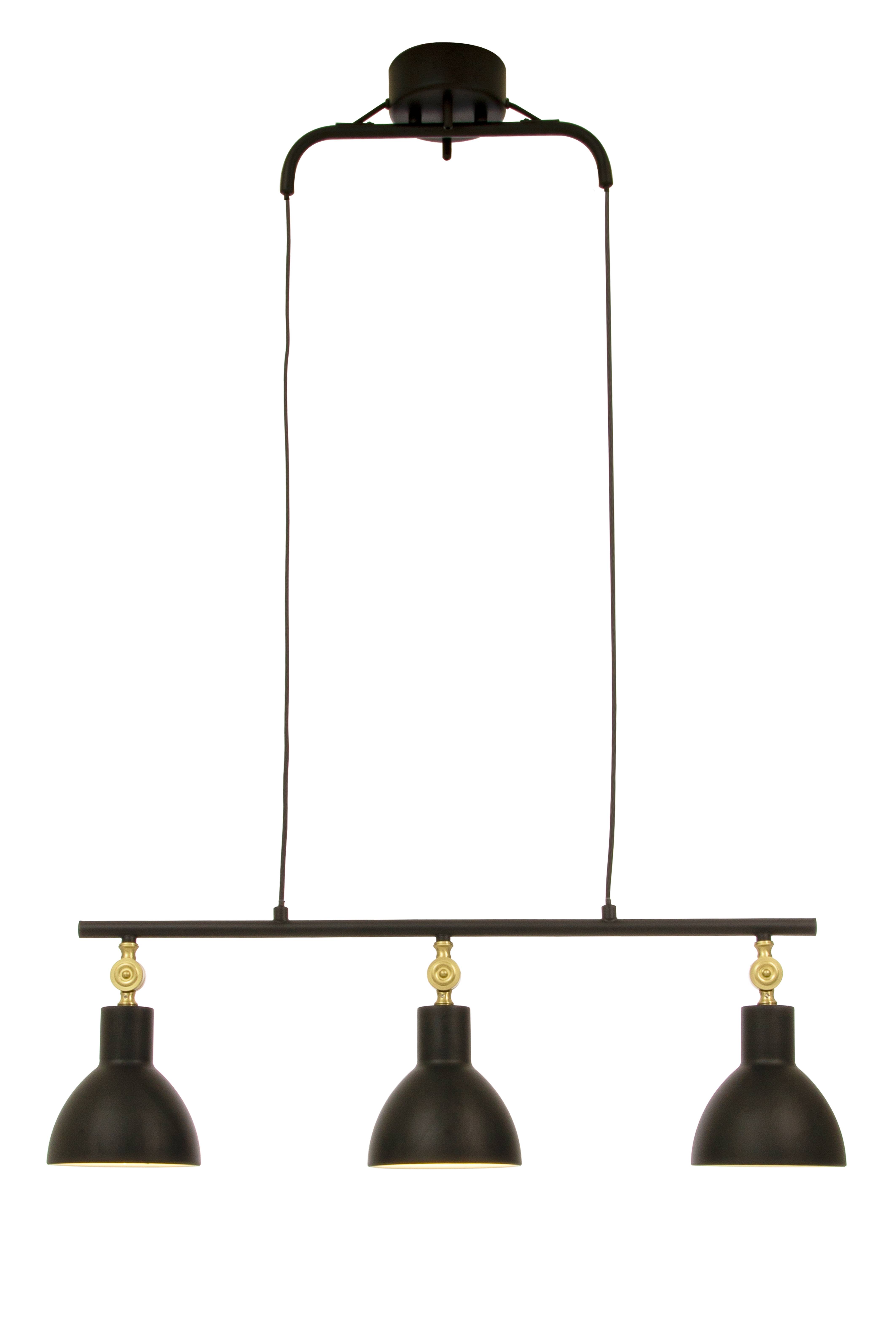 DUBLIN on klassinen ja helposti sijoitettava ruokapöydän valaisin mustaksi maalattua metallia. Yksityiskohdat mattapintaista messinkiä. 3 x 40 W, E27 (tilaa valonlähteet erikseen). Ripustuskoukku ja kattokuppi mustaa metallia.