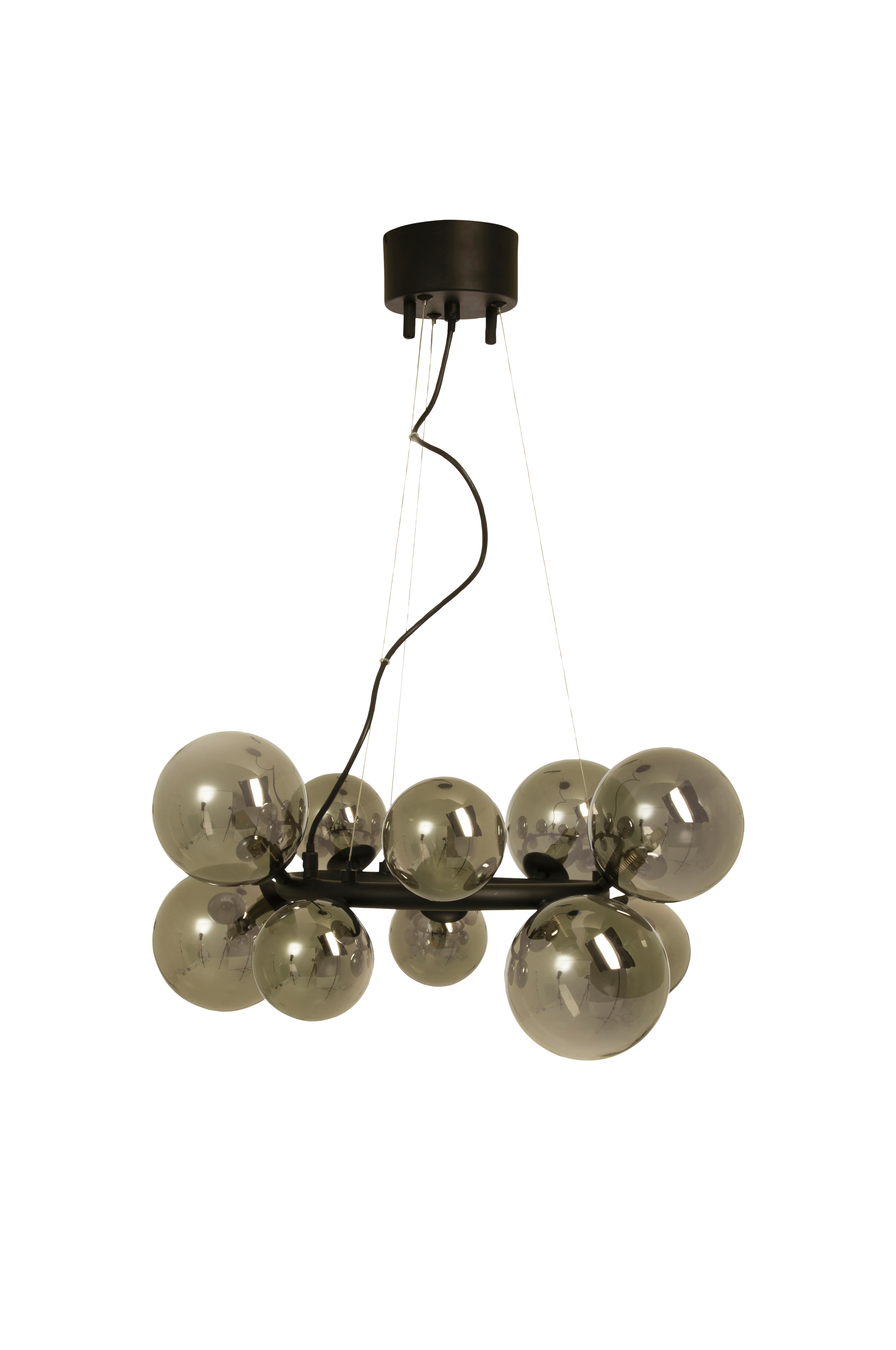 Molekyl on moderni ja pyöreä maalatusta metallista valmistettu kattovalaisin, jossa on 10 lasikupua. Lasikuvut ovat kahta eri kokoa. 10 x 25 W. G9 (ei sisälly toimitukseen). Valaisin riippuu kolmen säädettävän vaijerin varassa. Ripustuskoukku ja metallinen kattokuppi.