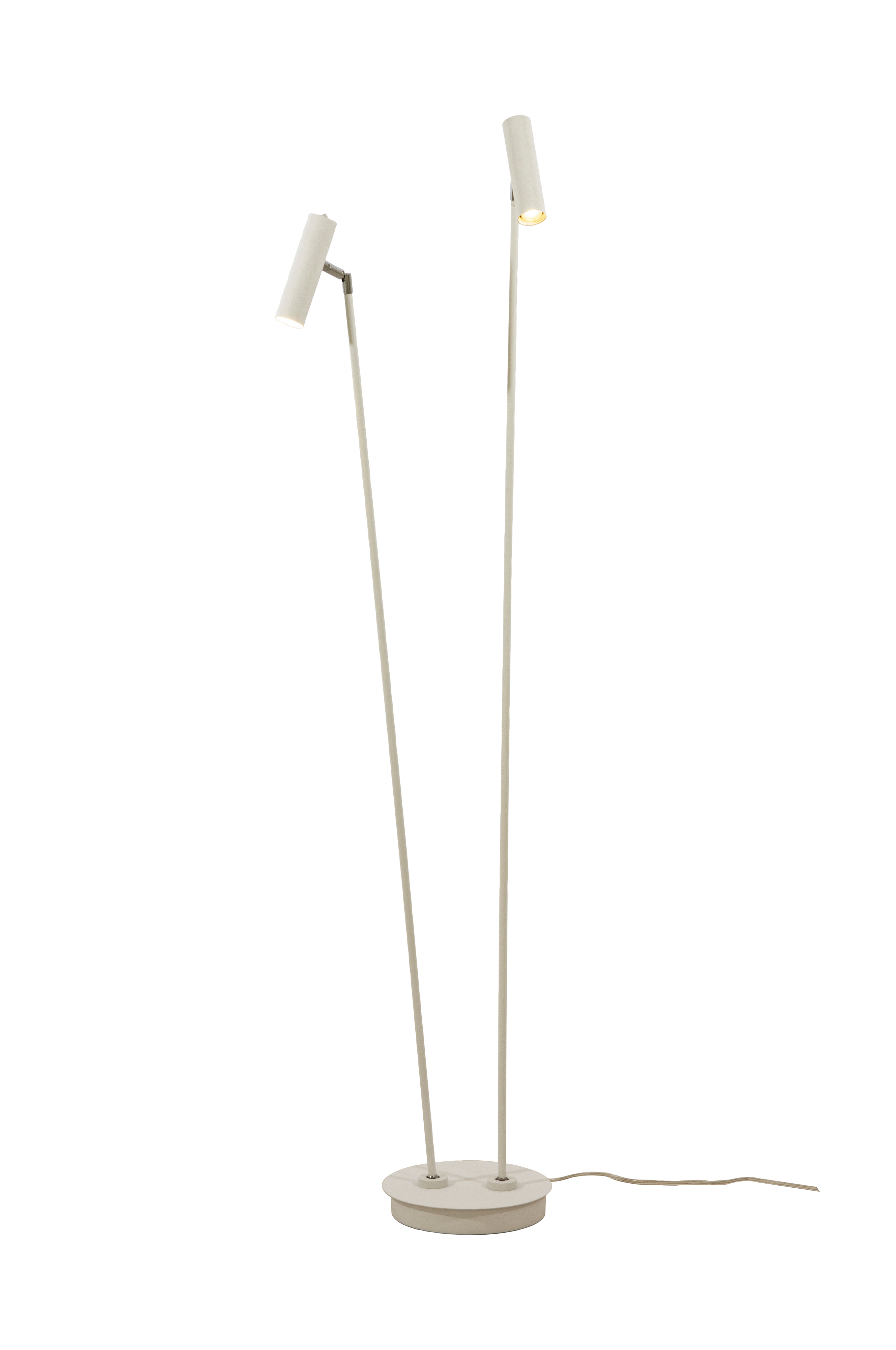Kaksiosainen Artic-lattiavalaisin valkoiseksi maalattua metallia, yksityiskohdat kromia. Integroidut LED-valonlähteet antavat miellyttävän lämpimän valkoisen valon. Valaisin sytytetään ja sammutetaan valaisimissa olevilla himmentimillä. Säädettävät varjostimet ja jalka.