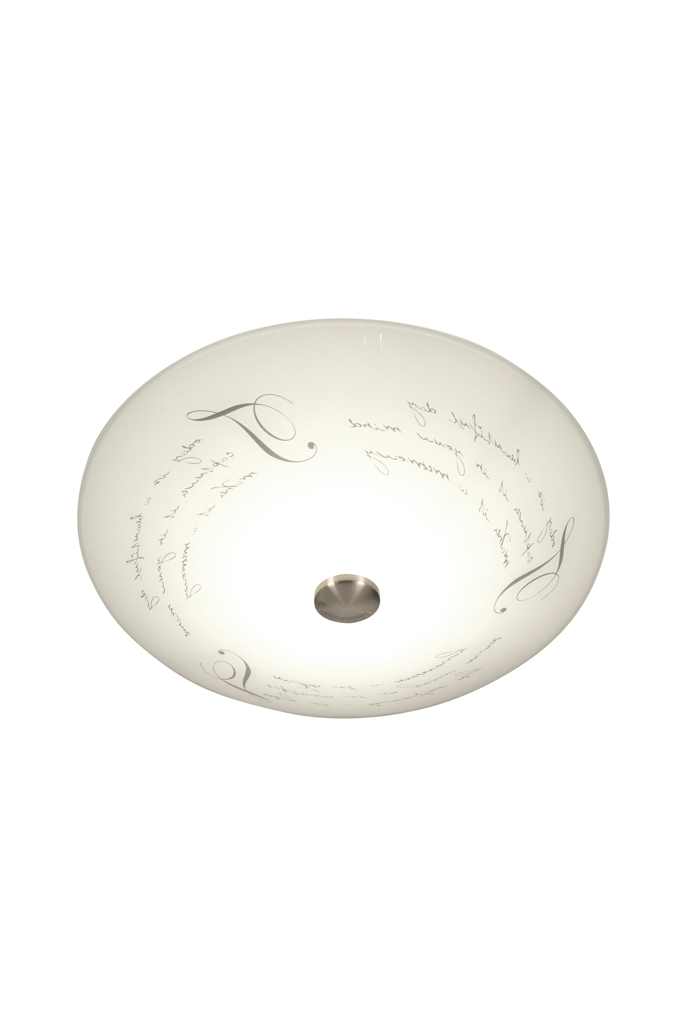 Valkoinen/teräksenvärinen Skrift-plafondi. Valaisimen ensisijainen materiaali on lasi. 3 x E27-lampunkanta. Valonlähde enintään 3 x 60 W. Valonlähteet eivät sisälly toimitukseen. Asennetaan ripustuskoukun avulla. Valaisin kytketään virtalähteeseen pistokkeen/riviliittimen avulla. IP20-luokitus.
