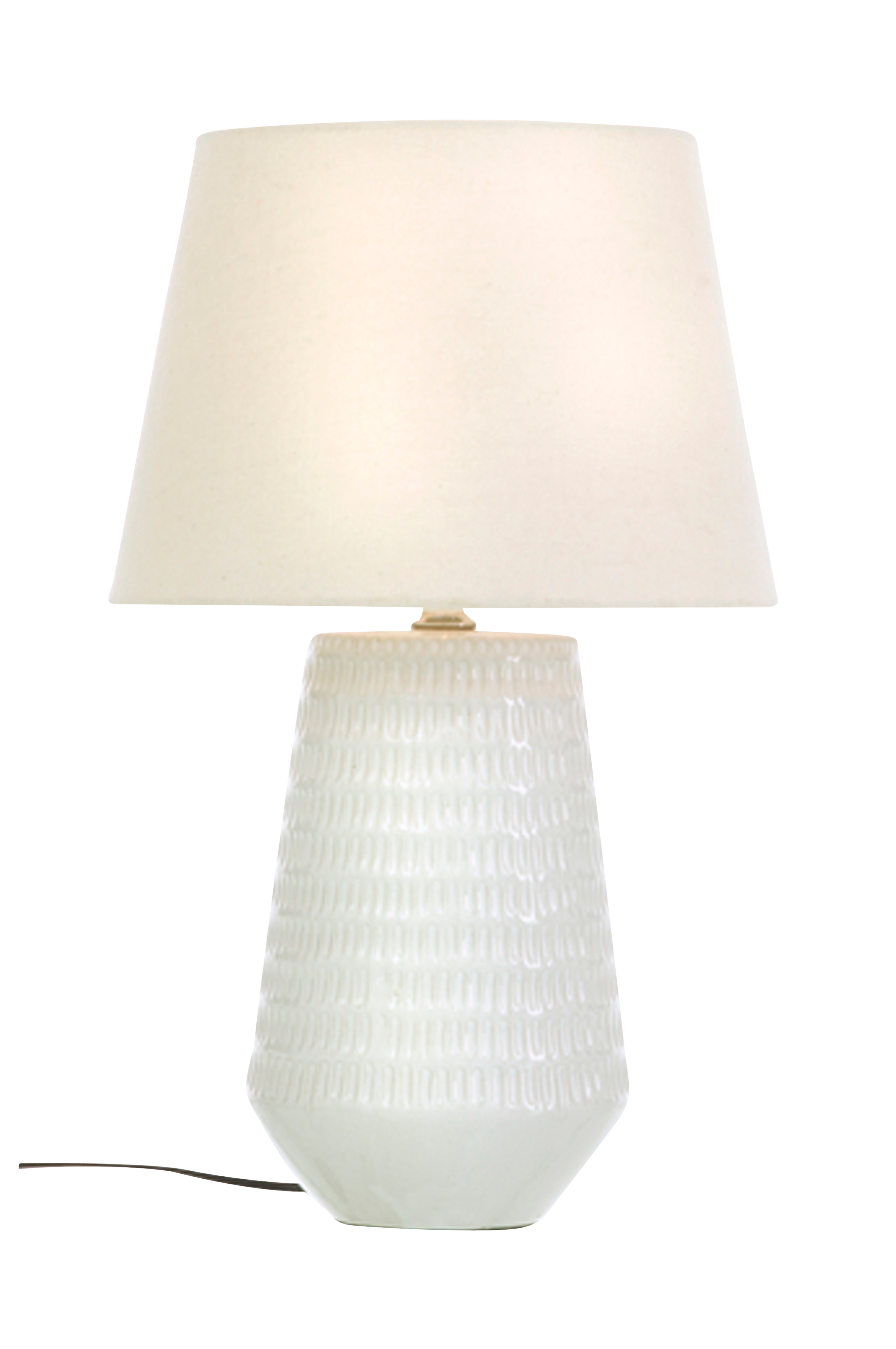 MONA-pöytävalaisi, jossa display ja virtakytkin johdossa. Materiaali: keramiikkaa ja kangasta