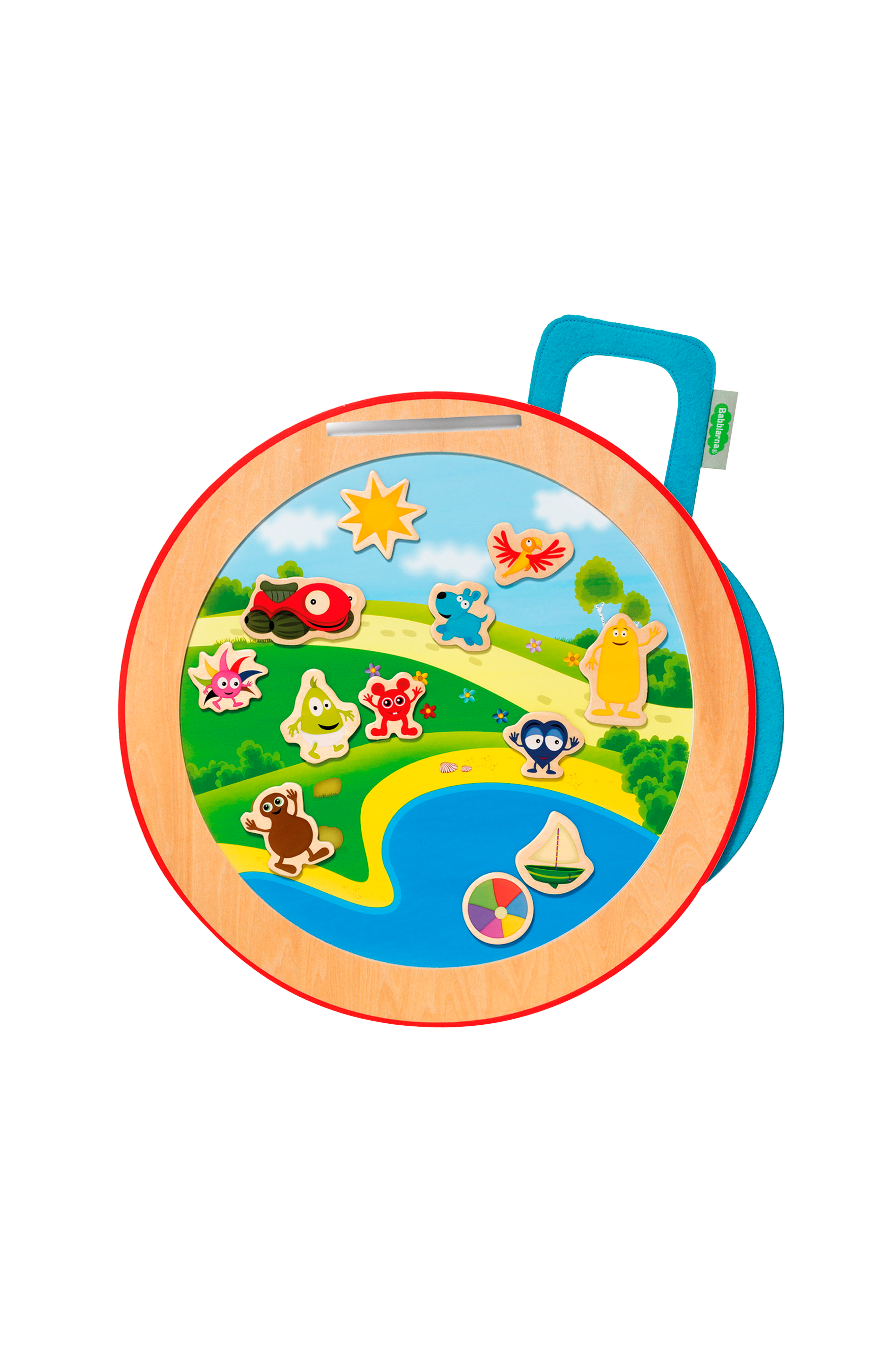 • Magneettinen puinen leikkitaulu, jossa on 18 magneettia, joissa on Babba, Bibbi, Bobbo, Dadda, Diddi, Doddo ja muita Pörinäpoppoo-hahmoja ja -esineitä.