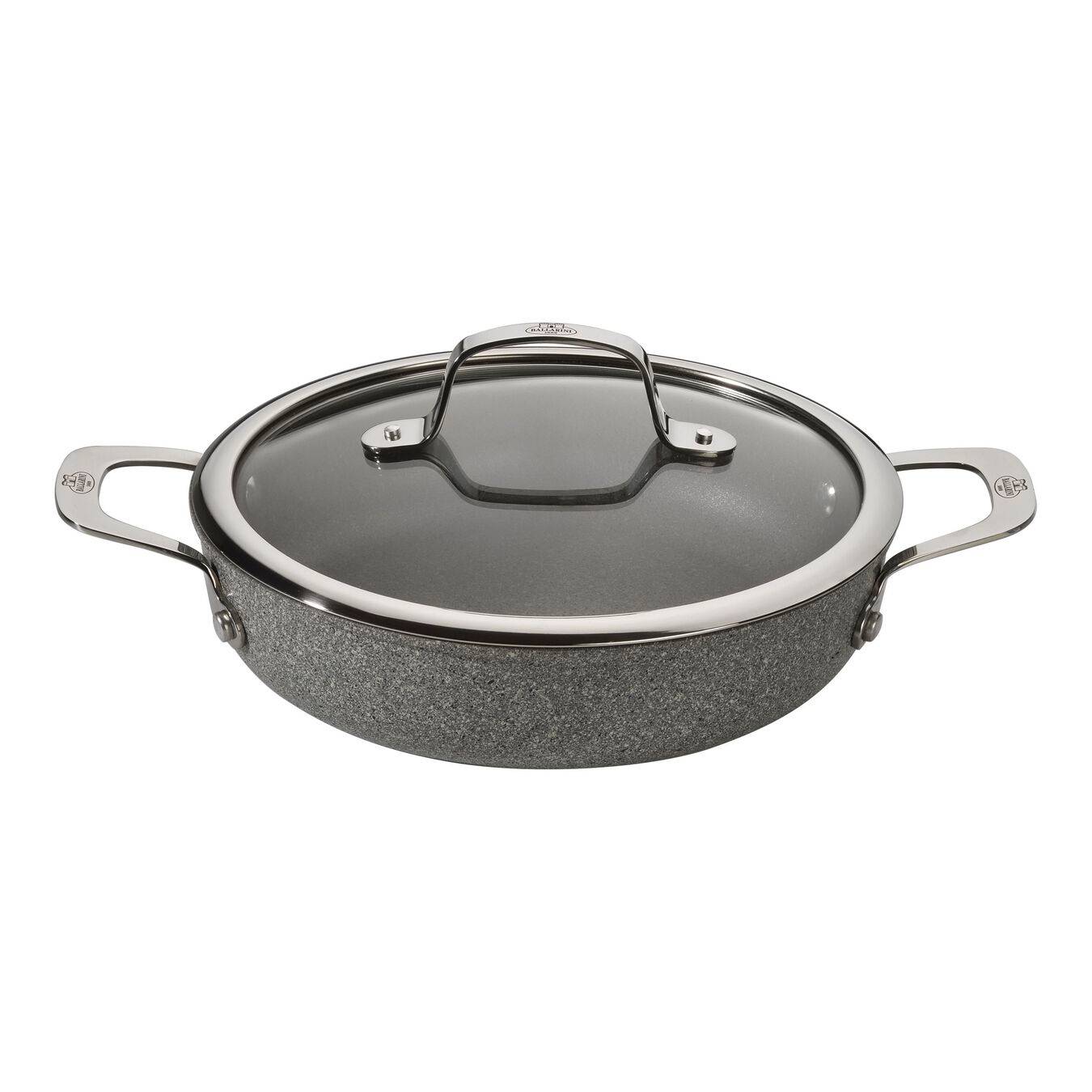 Ballarinin Salina-sarjan tarjoilupannu lasikannella. Halkaisija 24 cm. Graniittia muistuttavan ulkonäön ansiosta tarjoiluastia näyttää hyvältä pöydällä. Mutta se ei ole vain ulkopuoli, joka ratkaisee: Erittäin naarmunkestävä, tarttumaton ja kuusikerroksinen GRANITIUM Ti-X -pinnoite, jossa on lisäkerros titaania. Pinnoitteen ansiosta naarmuja ei synny juuri lainkaan. Korkeahkolla reunalla varustettu pannu on taottu massiivisesta alumiinista, minkä ansiosta se lämpenee nopeasti. Sopii induktioliedelle ja myös muille liesityypeille. Voidaan pestä astianpesukoneessa.
