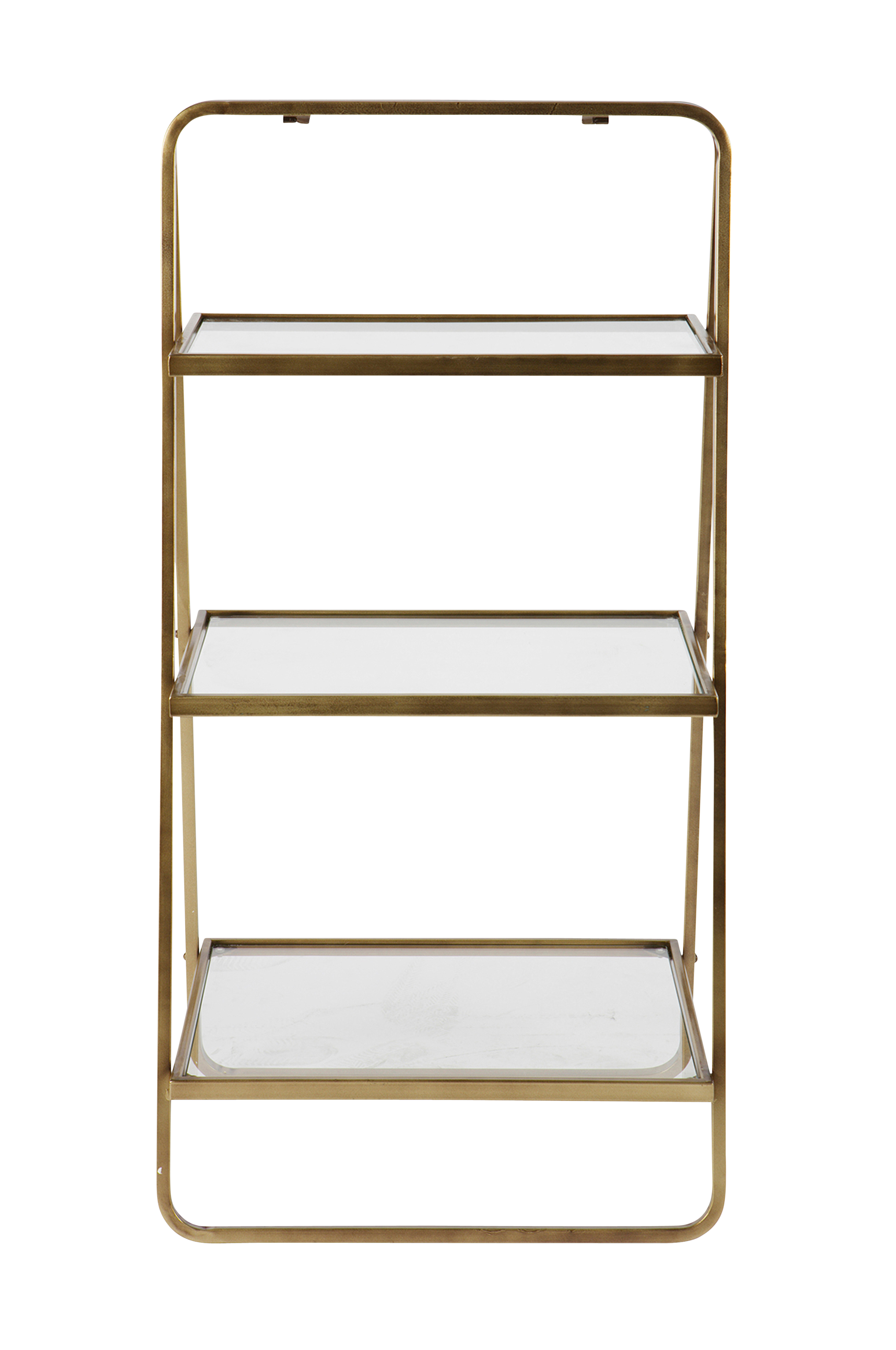 Metallia, lasihyllyt. Hyllykön sivut: K 106 x L 58 x S 33 cm. alahyllyn ja keskimmäisen hyllyn välinen etäisyys 32 cm. Keskimmäisen ja ylimmän hyllyn välinen etäisyys 27,5 cm. Erittäin käytännöllinen: Hyllykön voi taittaa kokoon. Viimeistele sisustus asettamalla hyllyille muutamia trendikkäitä, messinginvärisiä antiikkituotteita.
