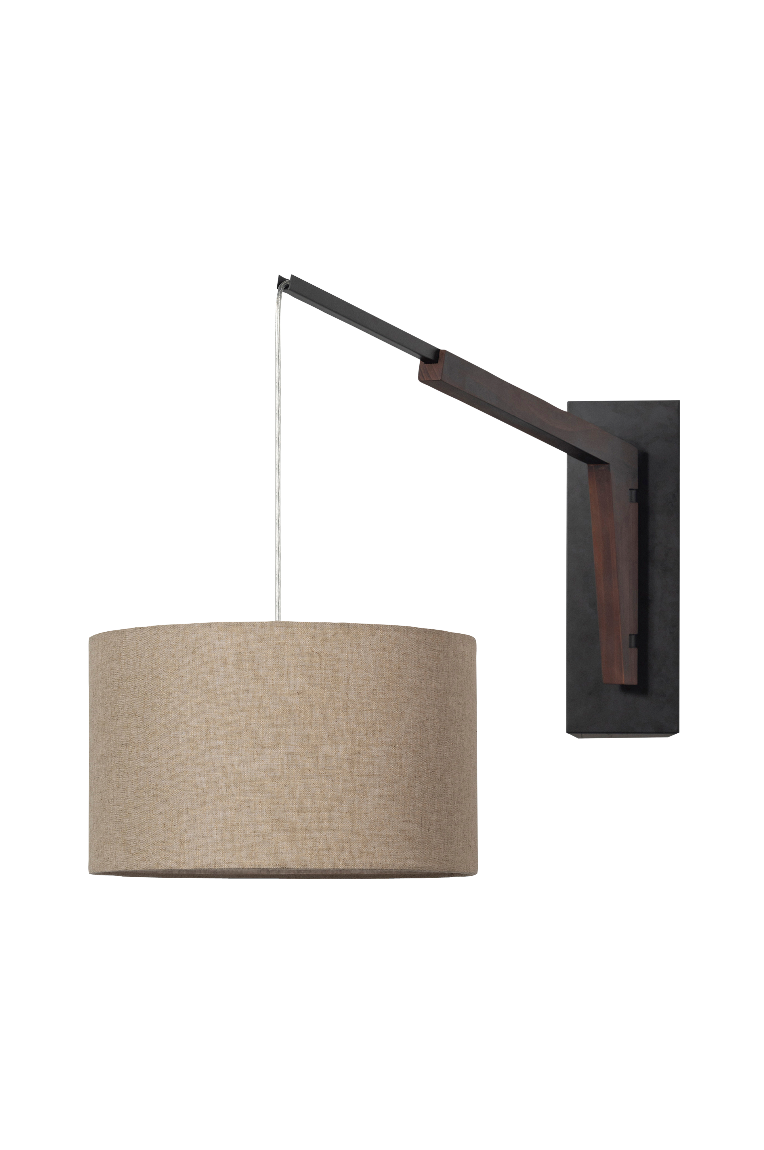 Säädettävä seinävalaisin on yhdistelmä pähkinäpuun väristä puuta ja mattamustaa metallia. Varjostin on mattavalkoista muovia ja päällystetty hiekanvärisellä pellavamaisella kankaalla.