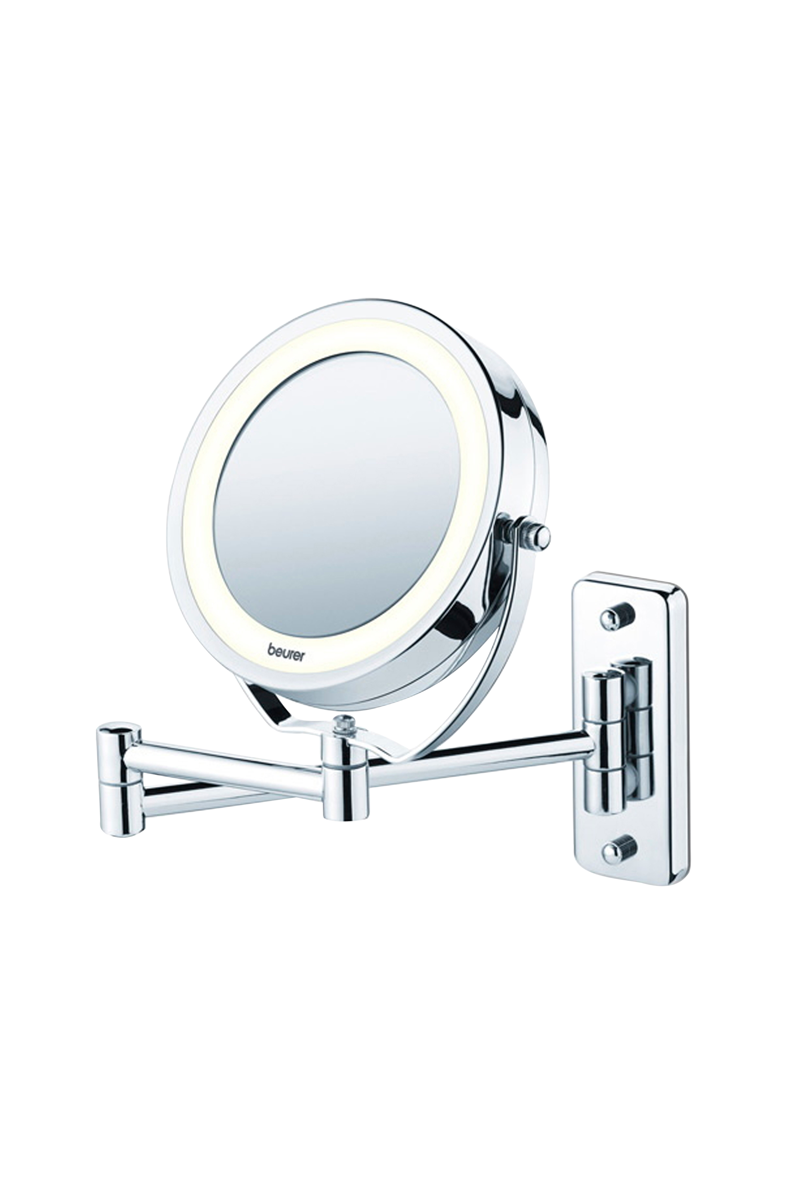 Valaistu, paristokäyttöinen meikkipeili. Peilipinnan halkaisija 11 cm. Voidaan ripustaa seinälle.