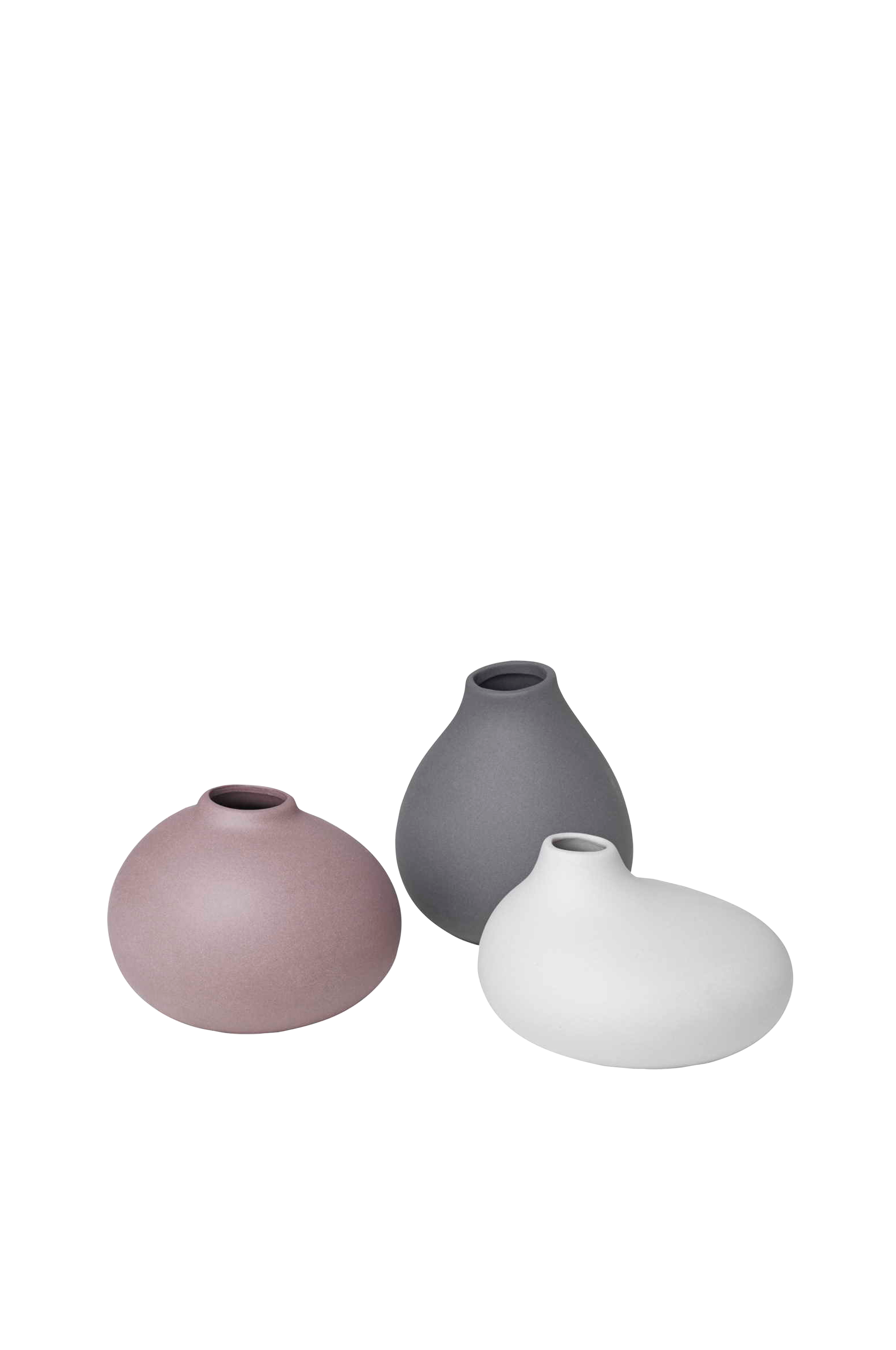 Kolme Blomus NONA -maljakkoa käsittelemätöntä posliinia. Kauniit maljakot on valmistettu kestävästä posliinista, joka on jätetty lasittamattomaksi ja rouheaksi. Pienet erot muodossa, värissä ja näkyvissä viivoissa tekevät jokaisesta NONA-maljakosta ainutlaatuisen.