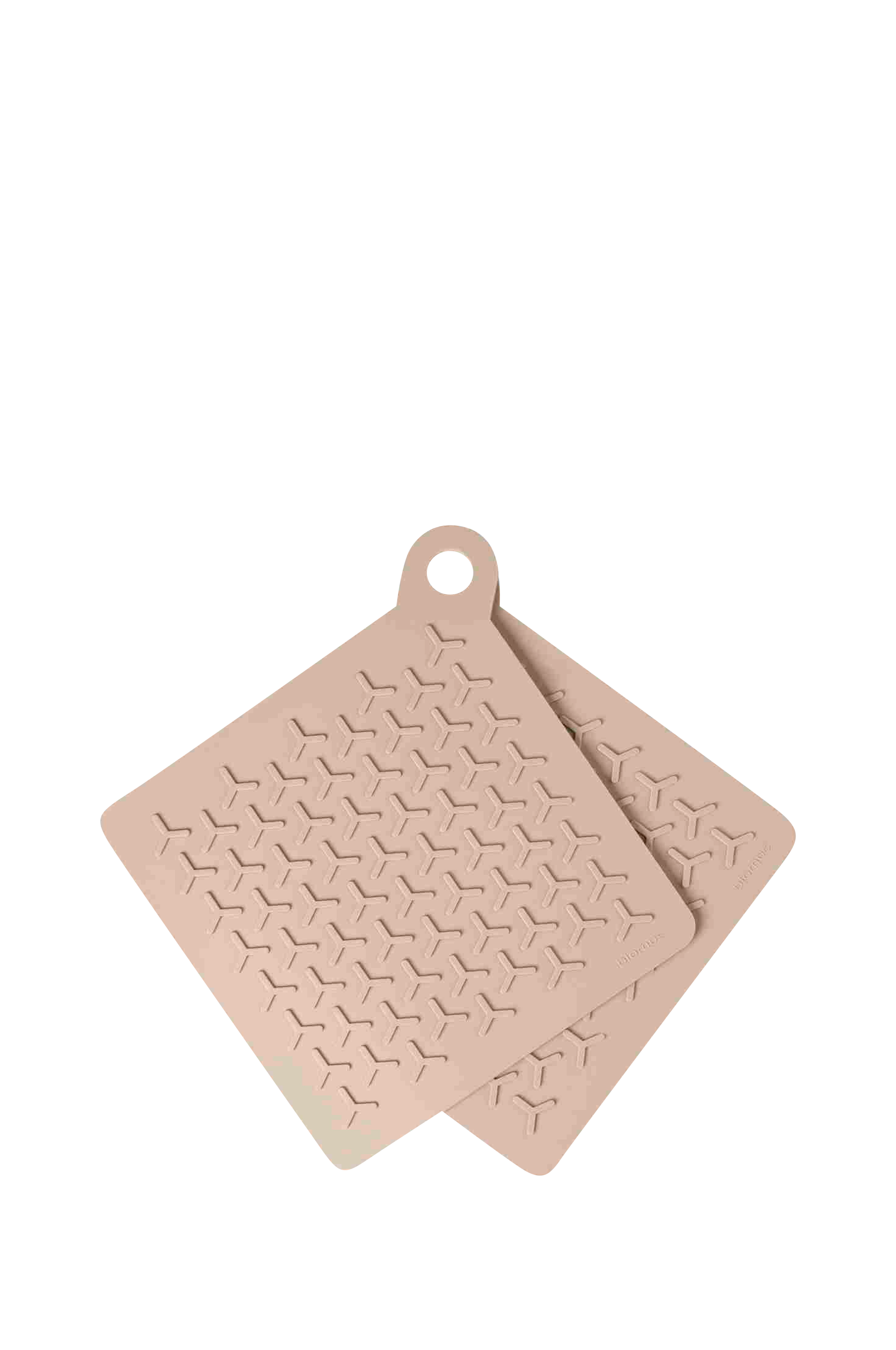 Tyylikkäät ja kestävät patalaput. Kahden kappaleen setti. Valmistettu laadukkaasta silikonista. Pinnan erityinen rakenne on pölyä ja ruokaa hylkivä ja helppo puhdistaa. Kestävät konepesun.