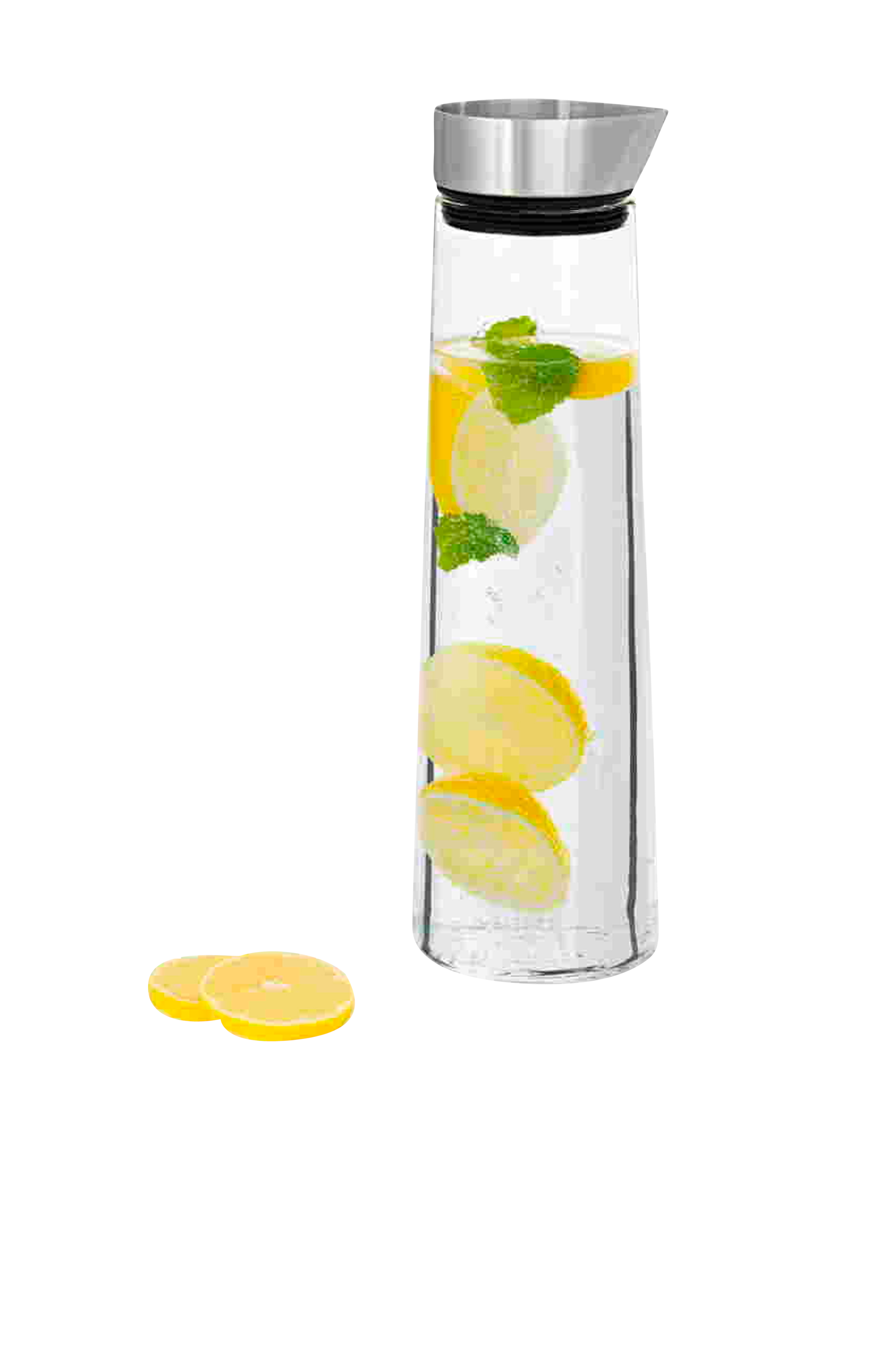Klassinen Blomus-vesikarahvi kirkasta lasia. Kansi mattapintaista ruostumatonta terästä ja silikonia. Materiaali: Mattapintaista ruostumatonta terästä, kirkasta lasia, silikonia. Mitat: Korkeus 30,5 cm, halkaisija 9 cm, tilavuus 1 l