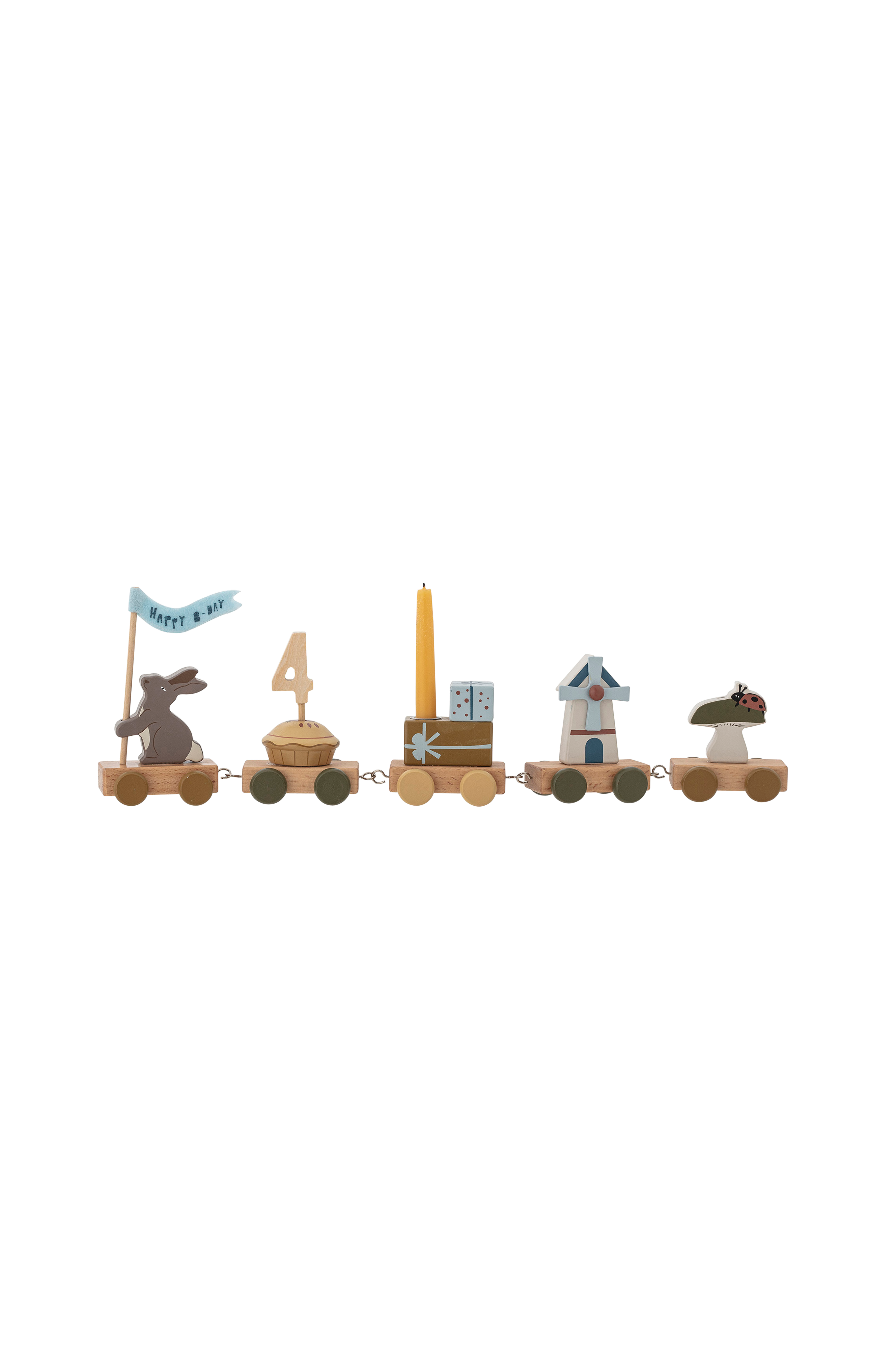 Bloomingville MINI Alfi -syntymäpäiväkoriste MDF-levyä. Uusi sievä sadonkorjuuaiheinen syntymäpäiväjuna on täydellinen koriste juhlapöytään. Toimitetaan lahjapakkauksessa, mukana sininen ja punainen lippu sekä numerot 0-9.