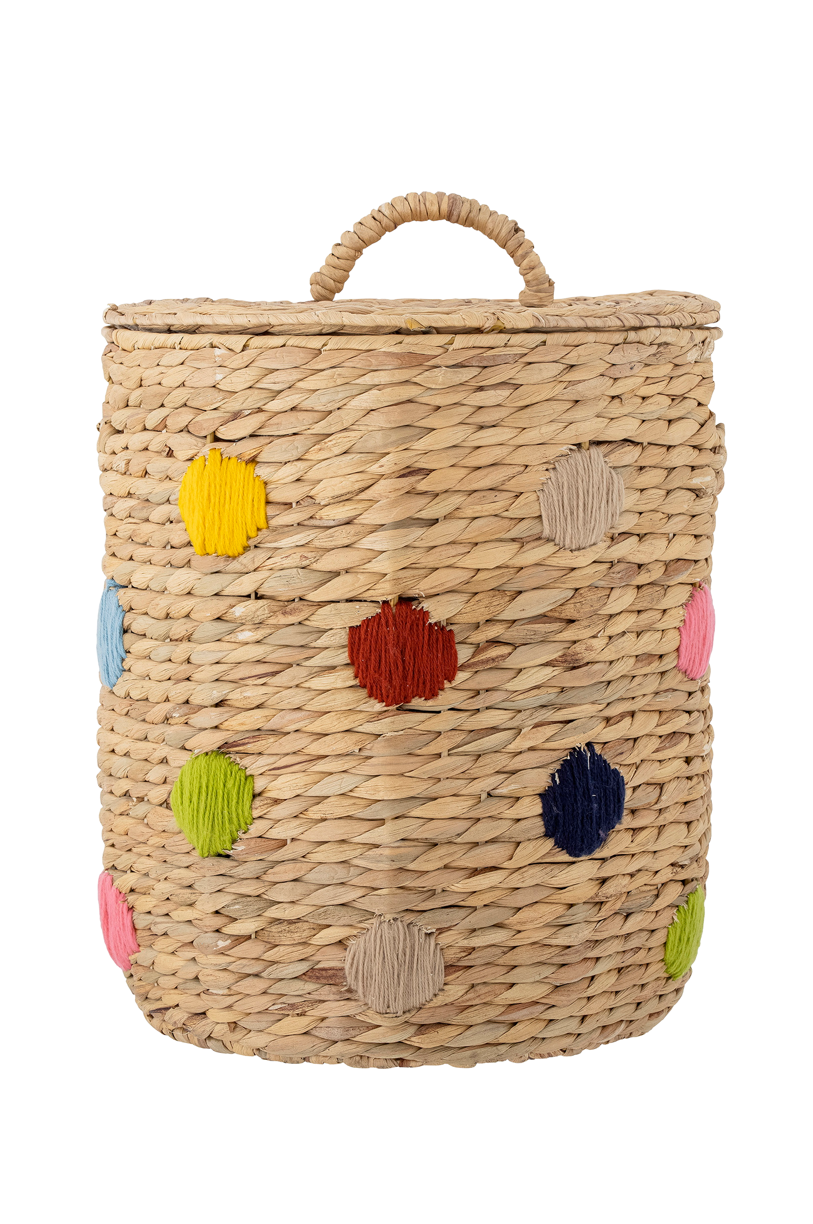Bloomingvillen MINI-valikoiman kannellinen Jooha-kori on käytännöllinen ja kaunis valinta kaikkiin lastenhuoneisiin. Kori on punottu vesihyasintista, ja siihen on kirjailtu suuria, värikkäitä pilkkuja, jotka antavat sille hauskan ja leikkisän ilmeen. Korissa voidaan säilyttää mitä vain leluista viltteihin, ja kansi pitää sisällön piilossa. S33xK38 cm