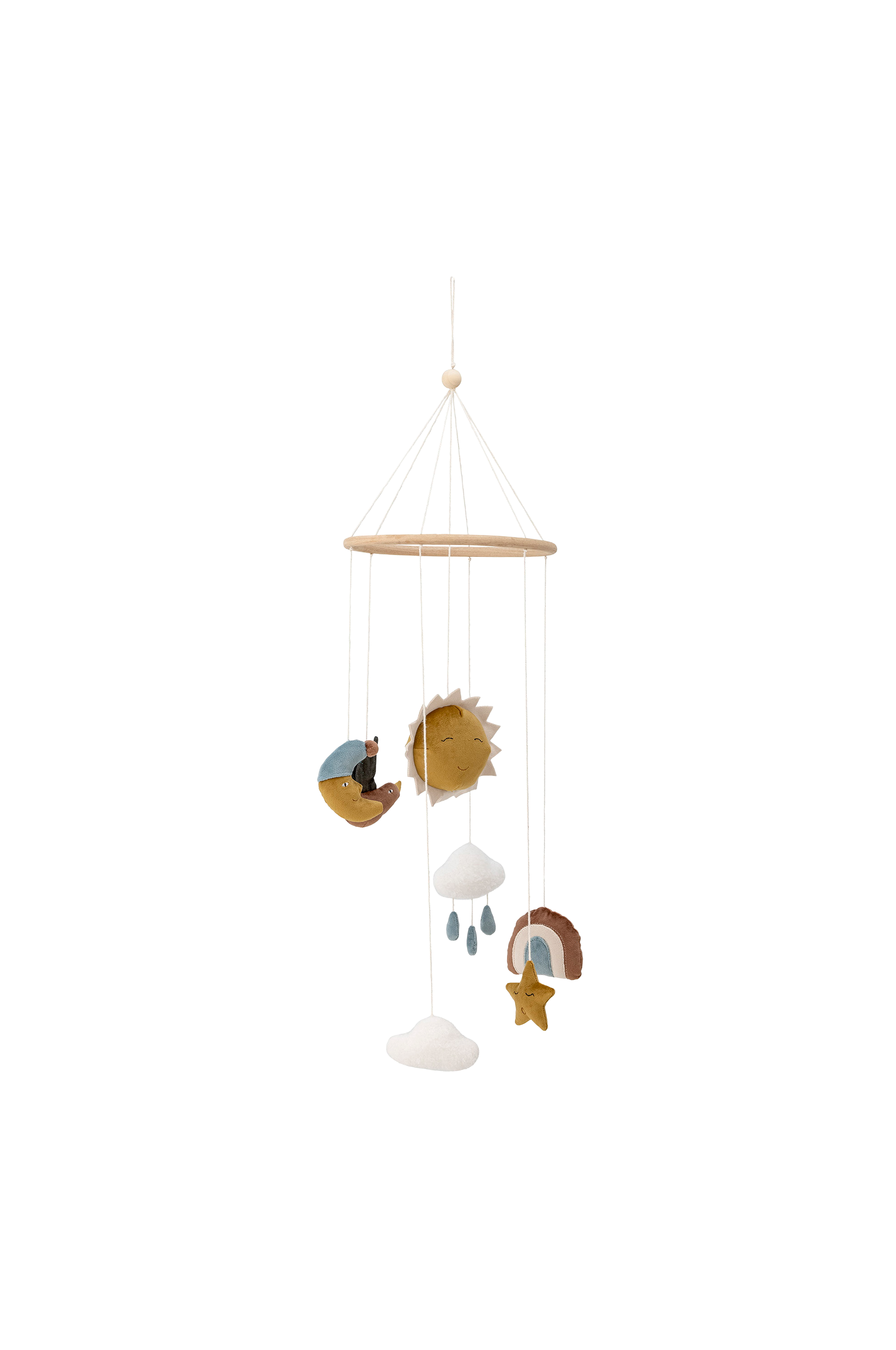 Bloomingville MINI Vigge on ihastuttava mobile, joka sopii täydellisesti hoitopöydän tai pinnasängyn yläpuolelle. Suloiset taivaankappaleet, kuten aurinko ja kuu, on valmistettu pehmeistä materiaaleista, mikä tekee mobilesta kutsuvan ja koristeellisen.