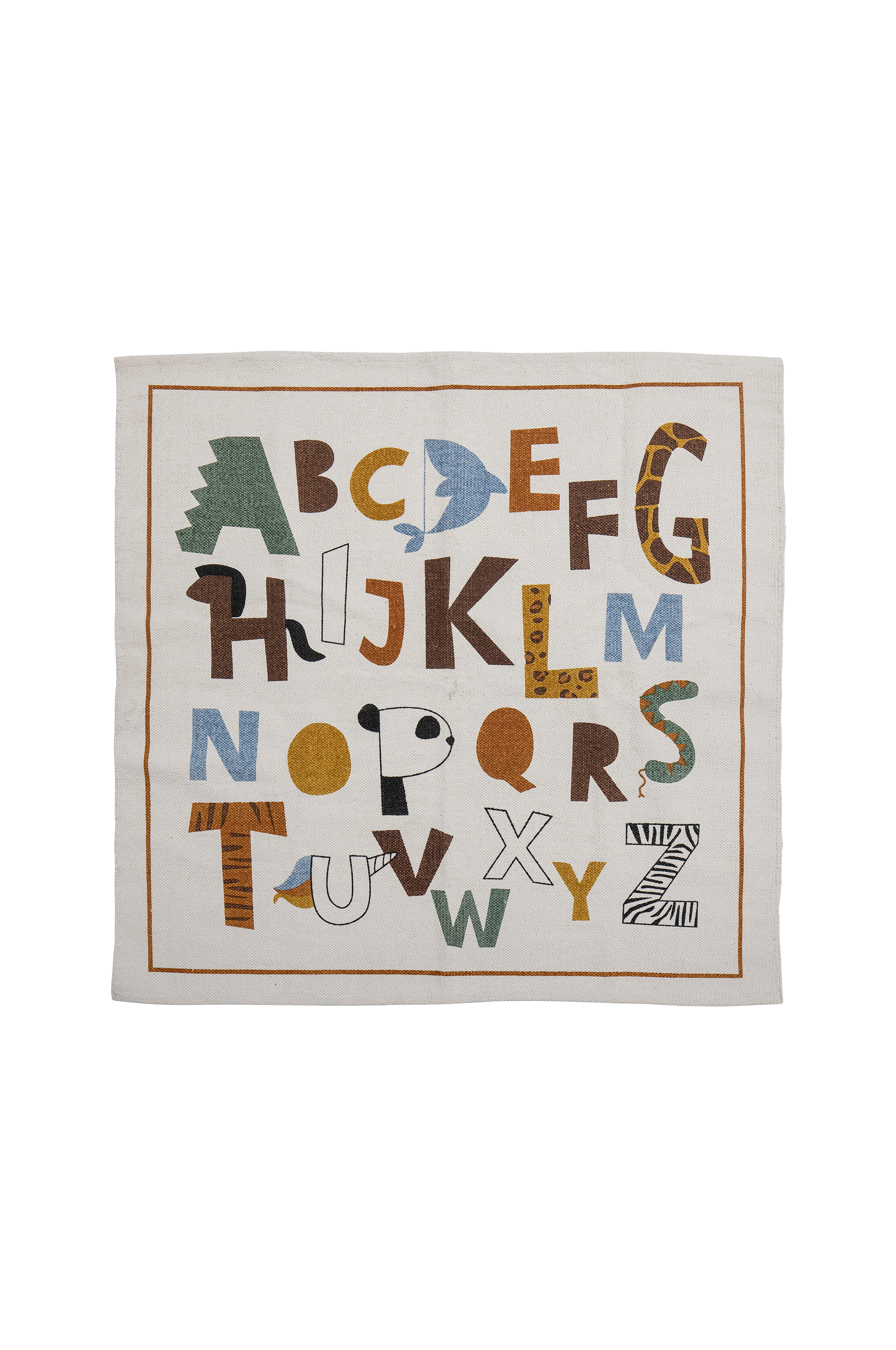 Bloomingville MINI Memmo -matto, jossa painetut kirjaimet. Kirjaimissa on hauska eläimen muoto ja hienot, pehmeät värit. Matto on koristeellinen, miellyttävä ja pedagoginen - täydellinen yhdistelmä. 95% puuvillaa, 5% sekoitekuituja.