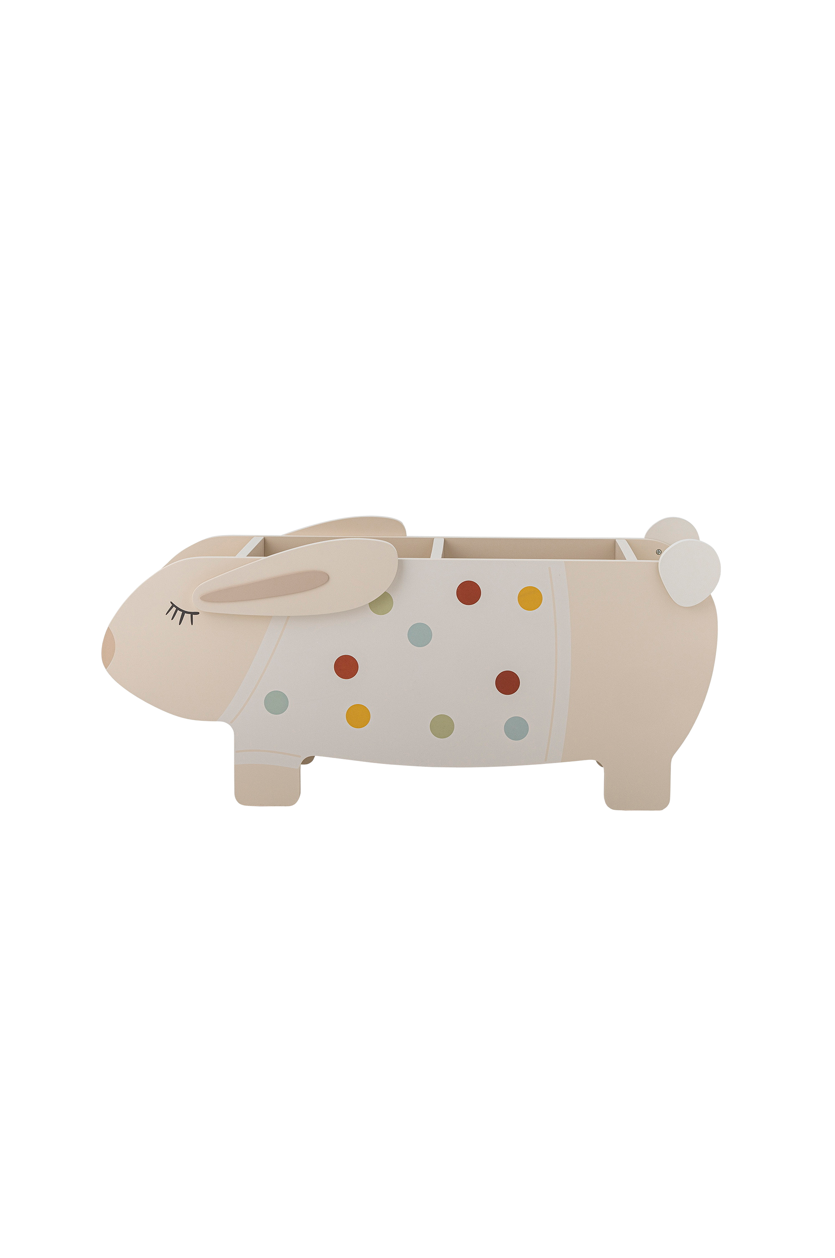 Bloomingville minin Villja-kirjahylly muistuttaa suloista pupua, jolla on pilkullinen villapaita. Siinä on mdf-levystä valmistetut hyllyt ja lokerot, jotka sopivat erinomaisesti lastenhuoneen kirjojen ja lelujen säilytykseen.