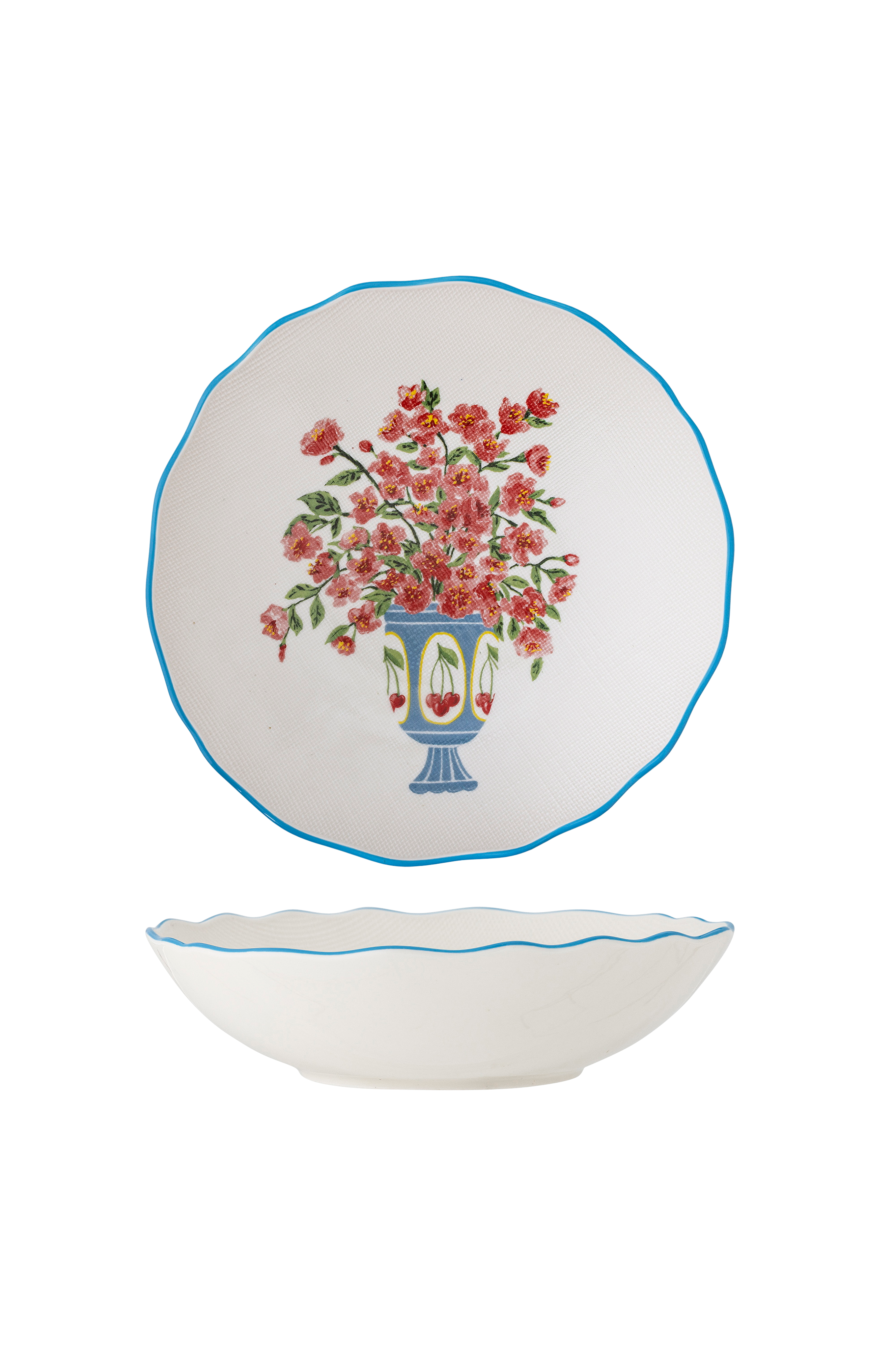 Bloomingvillen dorothy kulho on kaunis kivitavarakulho, jota koristaa hienovarainen kohokuvioitu kukka-aihe, joka muistuttaa kirjontaa, punaisen, vihreän ja sinisen sävyissä. Kulhossa on sinisellä reunalla uurrettu reunus, joka tuo kulhoon hienostuneen kosketuksen. Sopii täydellisesti salaattien tai pastaruokien tarjoiluun. Mitat: d28xk6,5 cm.