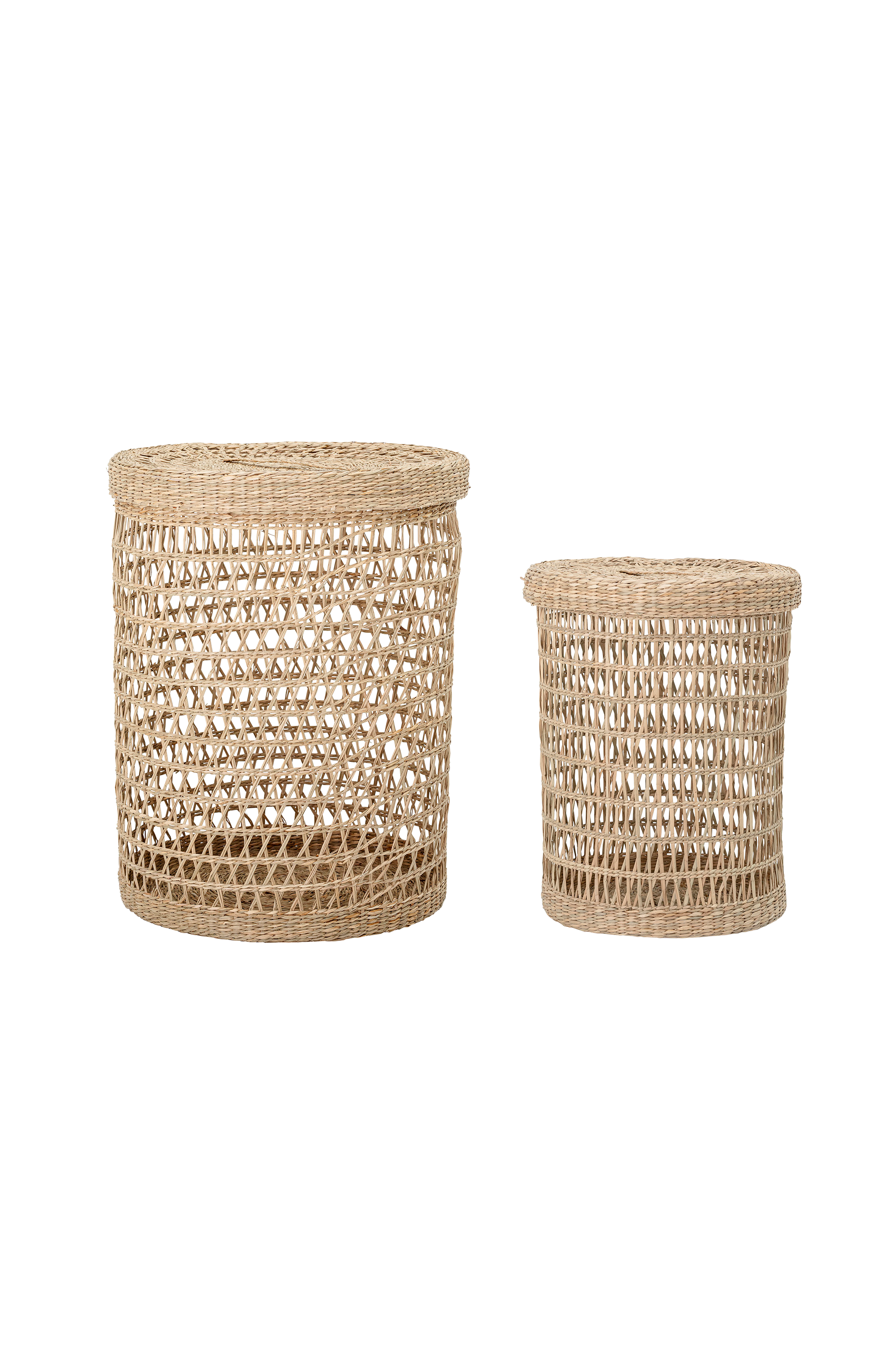 Setti, jossa kaksi meriheinäkoria. Korit sopivat pyykin, vilttien, WC-paperin ym. säilyttämiseen - sinä päätät. Mitat: pienen korin korkeus 40 cm, halkaisija 31 cm. Ison korin korkeus 53 cm, halkaisija 41 cm.