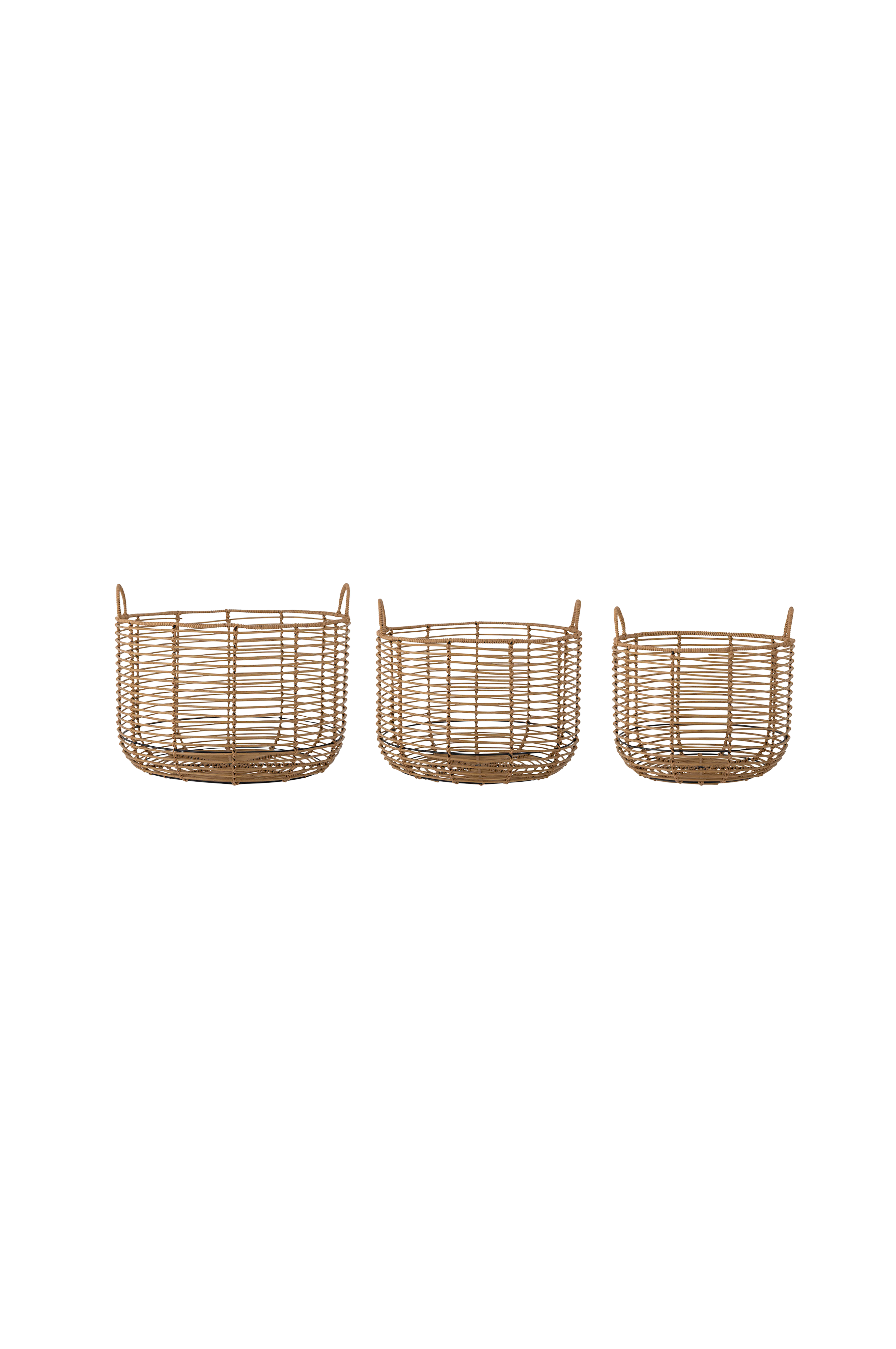Bloomingvillen Mekkel-korisetti, jossa kolme erikokoista polyrottingista valmistettua koria. Erikokoiset korit ovat erittäin monikäyttöiset, koska niissä voi säilyttää monia erilaisia tavaroita. Kaikkea aina pikkutavaroista viltteihin ja tyynyihin. Korien luonnollinen materiaali tuo huoneeseen orgaanista ja rentoa tunnelmaa riippumatta siitä, mihin tarkoitukseen käytät niitä. Mitat: Halkaisija 34, korkeus 32 cm. Halkaisija 39, korkeus 34 cm. Halkaisija 44, korkeus 36 cm.