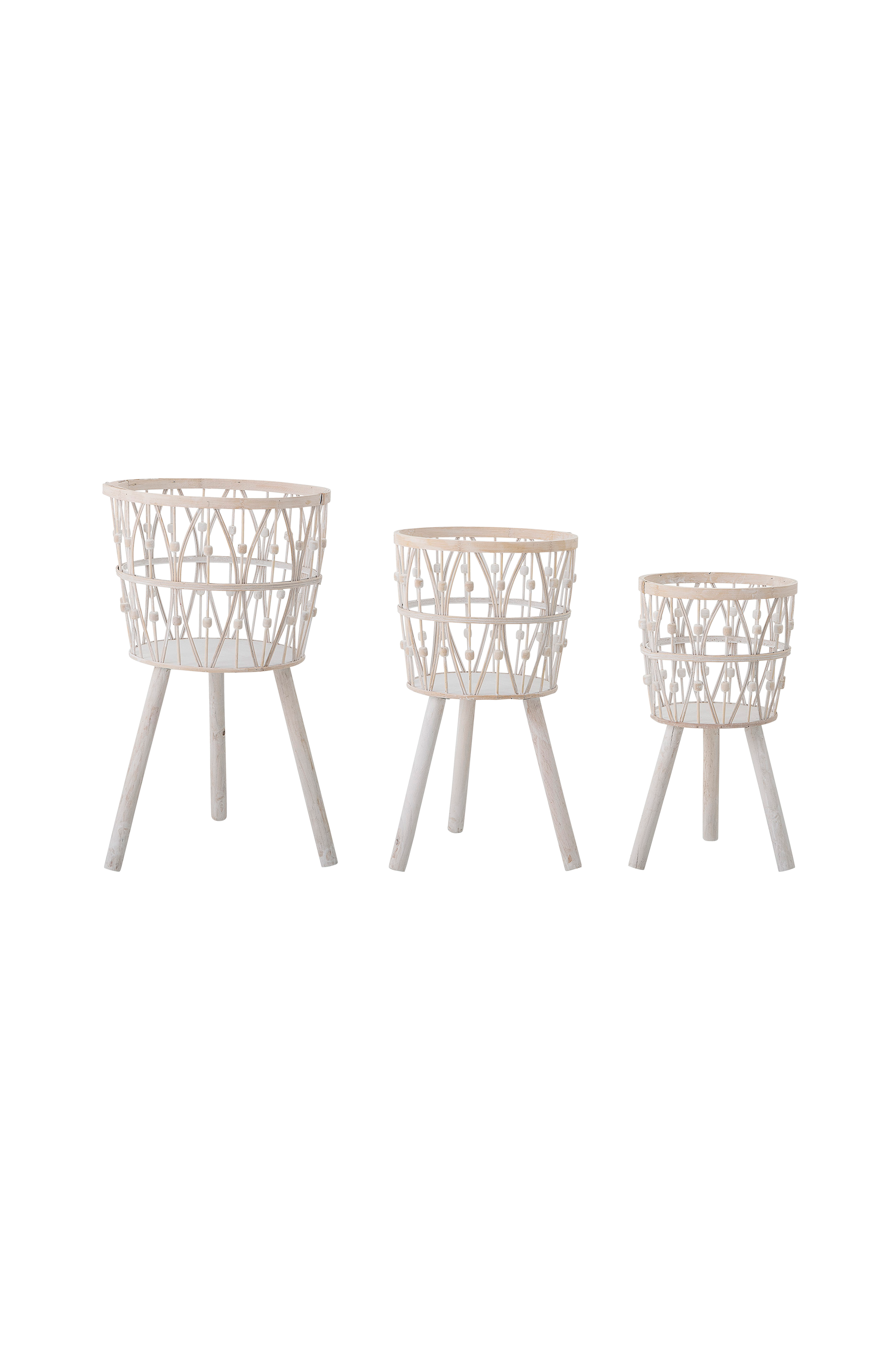 Setti, jossa kolme erikokoista koristeellista valkoista bambukukkaruukkua. Mitat: Pienen korkeus 49, halkaisija 27,5 cm. Keskikokoisen korkeus 57 cm, halkaisija 32 cm. Ison korkeus 65 cm, halkaisija 37 cm. Enimmäiskuormitus: 5/8/12 kg.