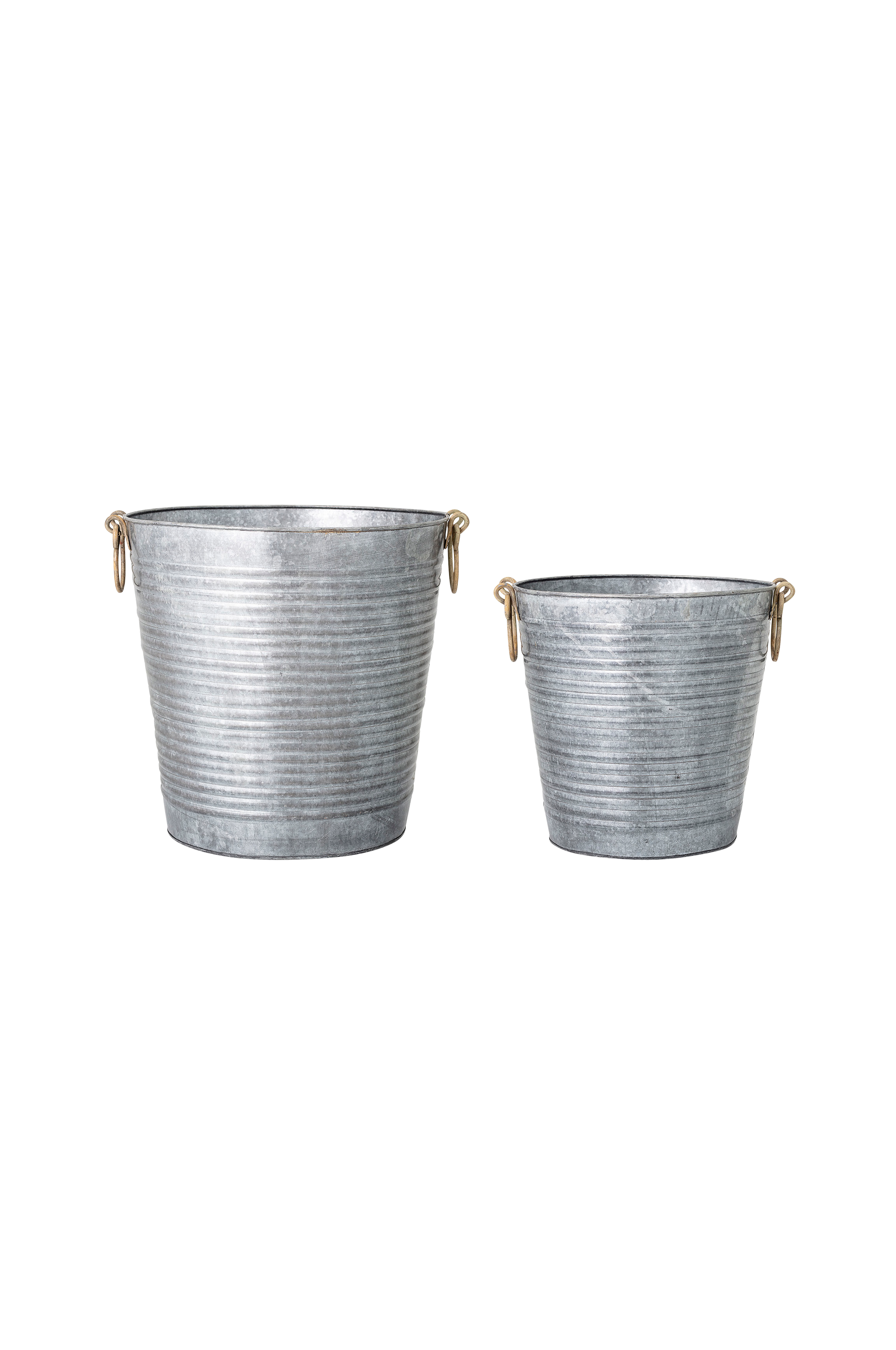 Setti, jossa kaksi metalliruukkua antiikkiviimeisteltyä galvanoitua sinkkiä. Pinnoite ehkäisee ruostumista ja pidentää kestävyyttä ulkokäytössä. Metalliset kantokahvat helpottavat ruukkujen siirtämistä puutarhassa. Mitat: Pienen korkeus 40, halkaisija 40 cm. Ison korkeus 50, halkaisija 50 cm.