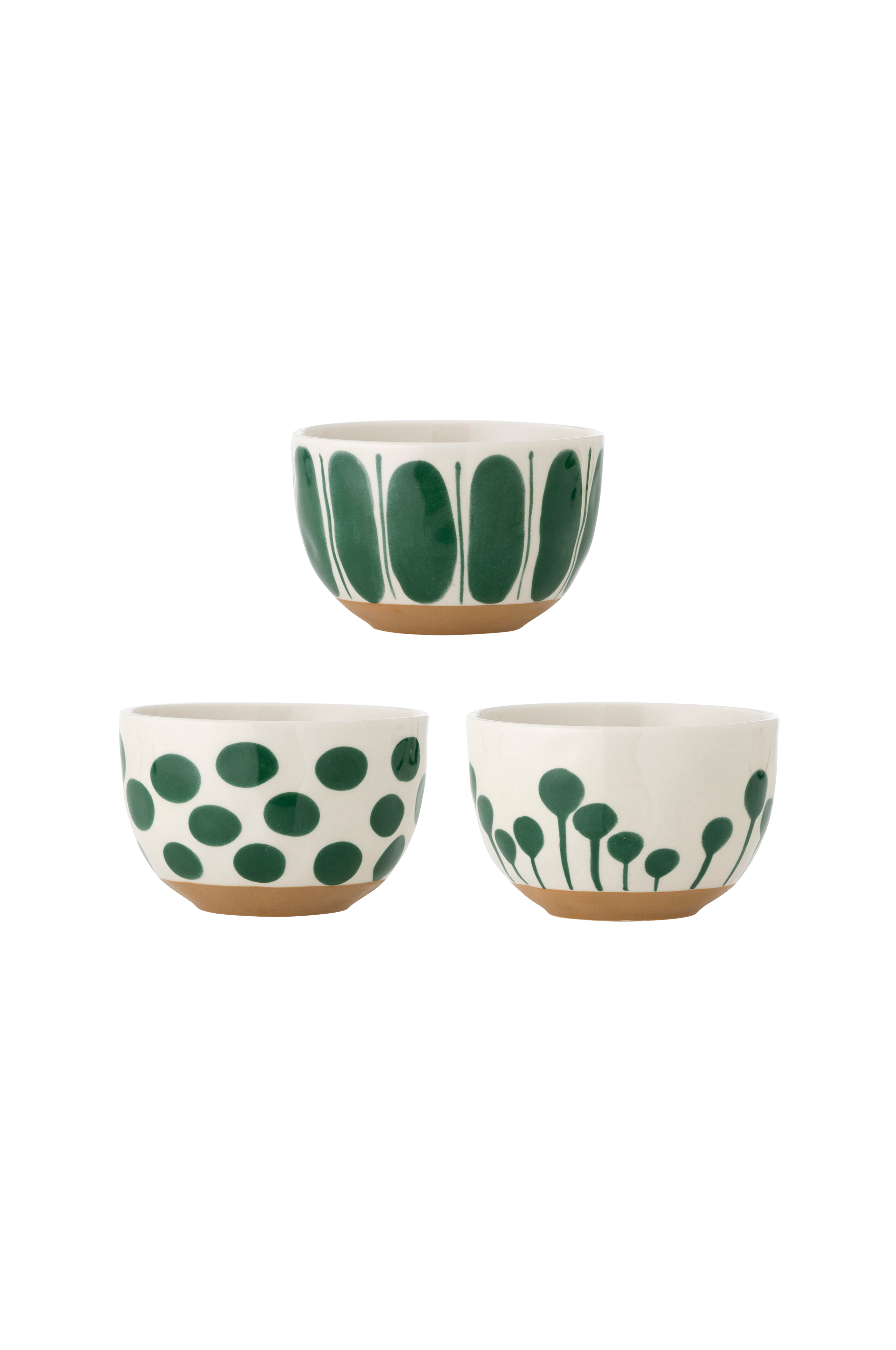 Creative Collectionin linora kulhot ovat 3 kauniin kivitavarakulhon sarja, joissa jokaisessa on ainutlaatuisia kuvioita tummanvihreissä sävyissä. Luonnollisen, lasittamattoman pohjan ansiosta ne luovat rustiikkisen ja kontrastisen yksityiskohdan, joka tuo keittiöösi luonnetta. Nämä kulhot sopivat erinomaisesti välipalojen, aamiaismurojen tai pienten salaattien tarjoiluun, ja niitä voi käyttää myös kodin koristeina. Mitat: D12,5xH8 cm, 3 kpl:n setti.