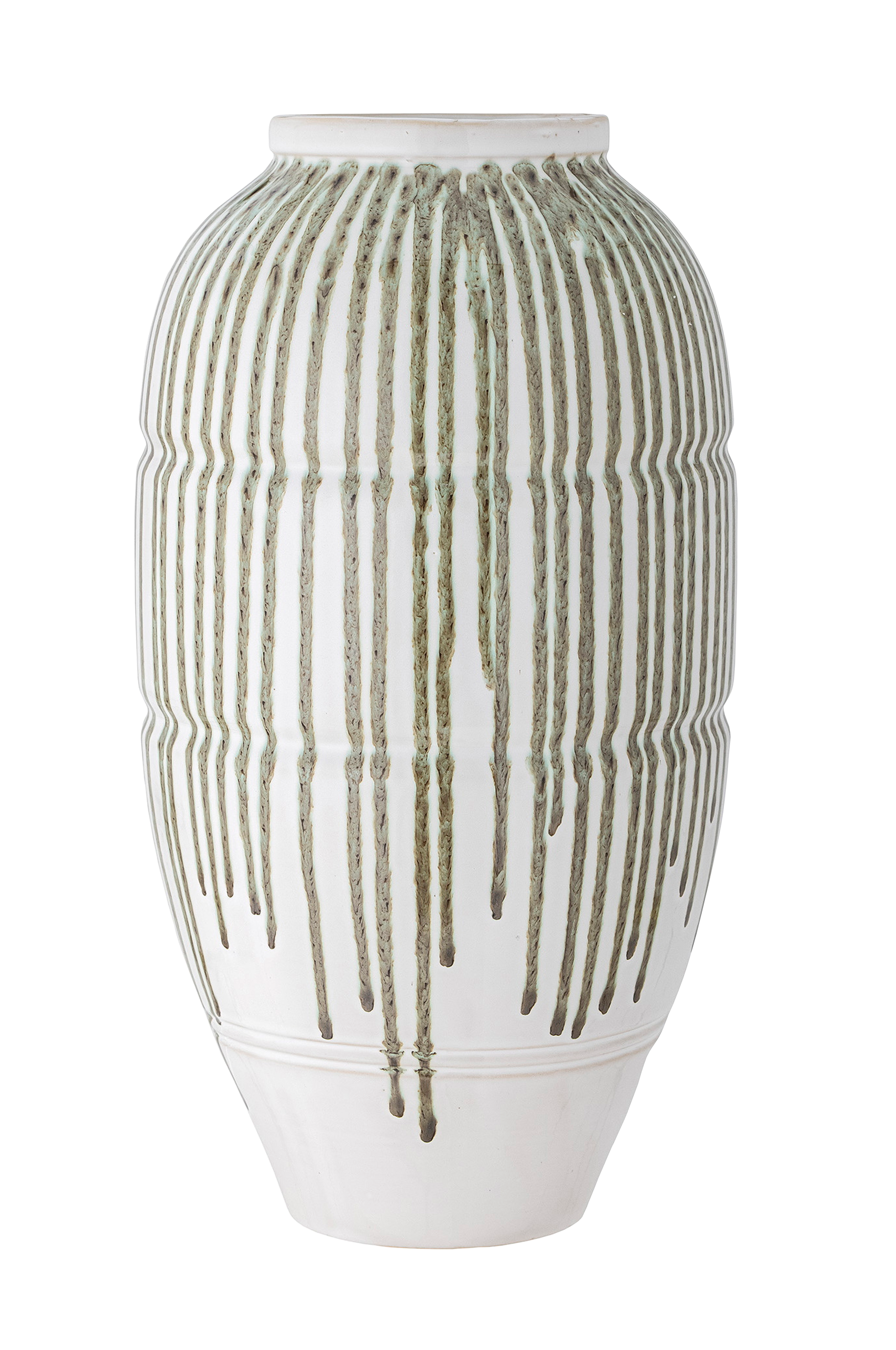 Creative Collectionin korkea ja kaunis, valkoinen Scarlet-maljakko, joka on koristeltu käsin vihreällä, valuvalla lasitteella. Maljakko sopii täydellisesti sekä lattialle että pöydälle. Jokainen käsin koristeltu tuote on ainutlaatuinen. S25,5xK47 cm.
