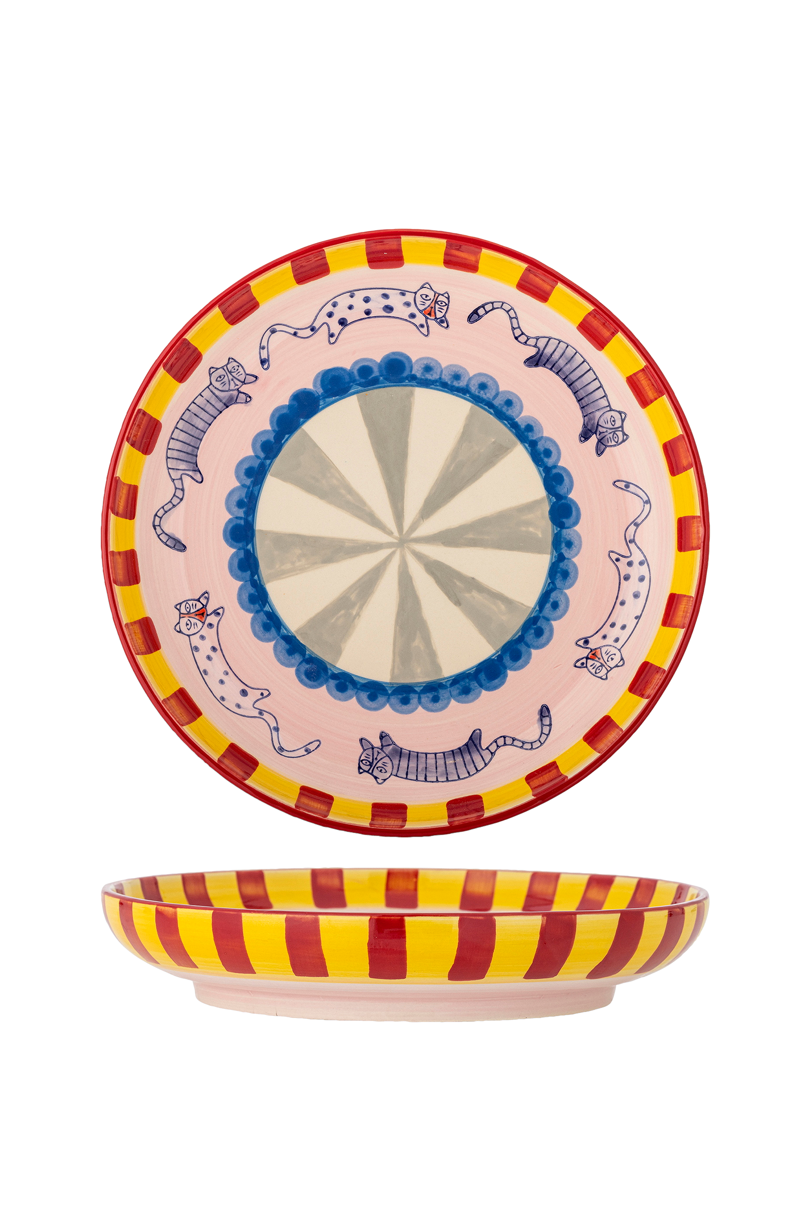 Bloomingvillen Missy tarjotin on kivitavaraa, jossa on yksityiskohtaisesti kuvioitua nuppineulapyörää ympäröiviä reunaraitoja ja kissa-aiheita. Käsinmaalattu; vaihtelua voi esiintyä.