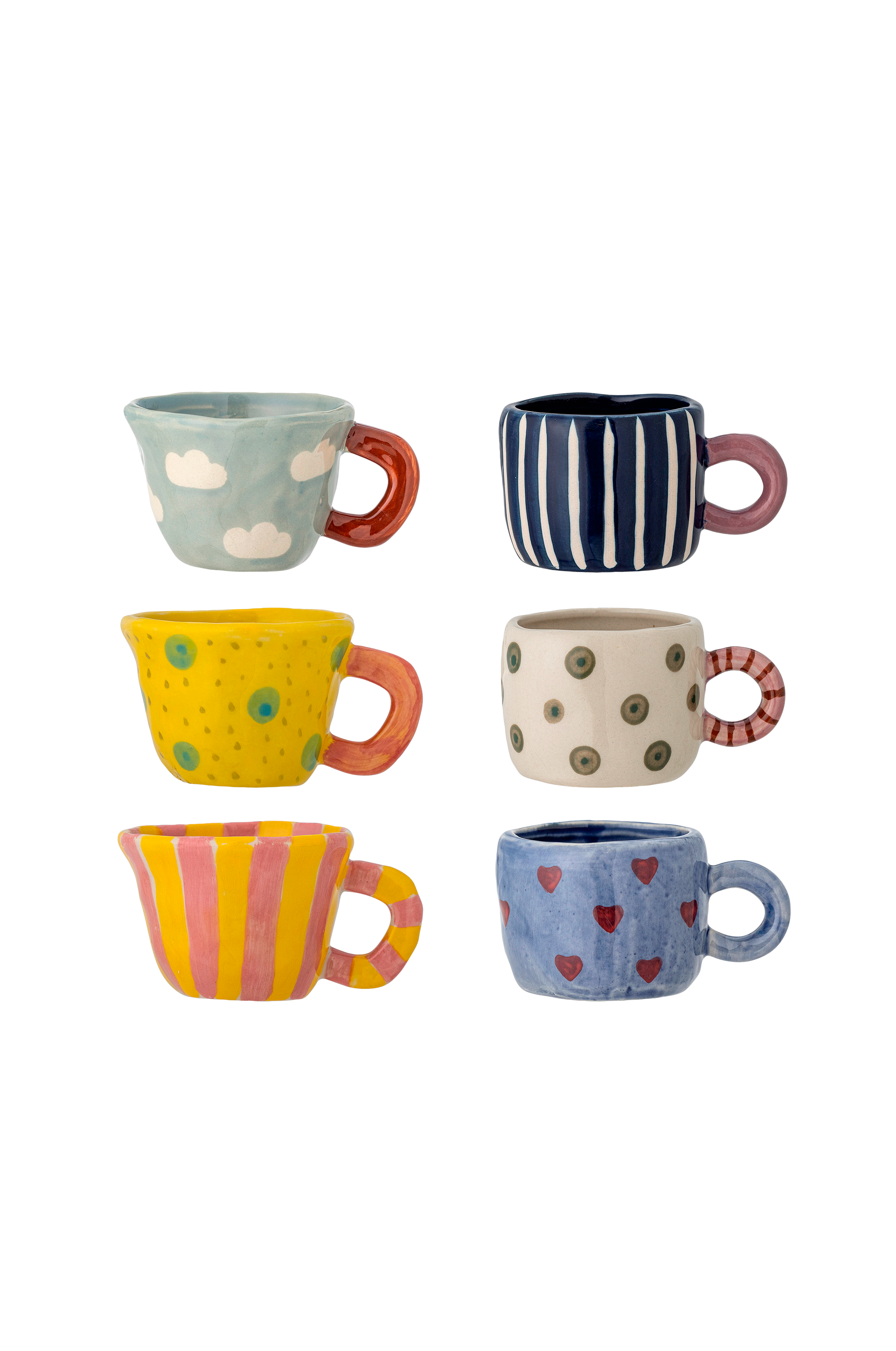 Bloomingvillen Nini cup on kuuden kivitavarakupin sarja, jossa on leikkisiä käsinmaalattuja kuvioita, kuten sydämiä, pilviä ja raitoja. Vaihtelua voi esiintyä.
