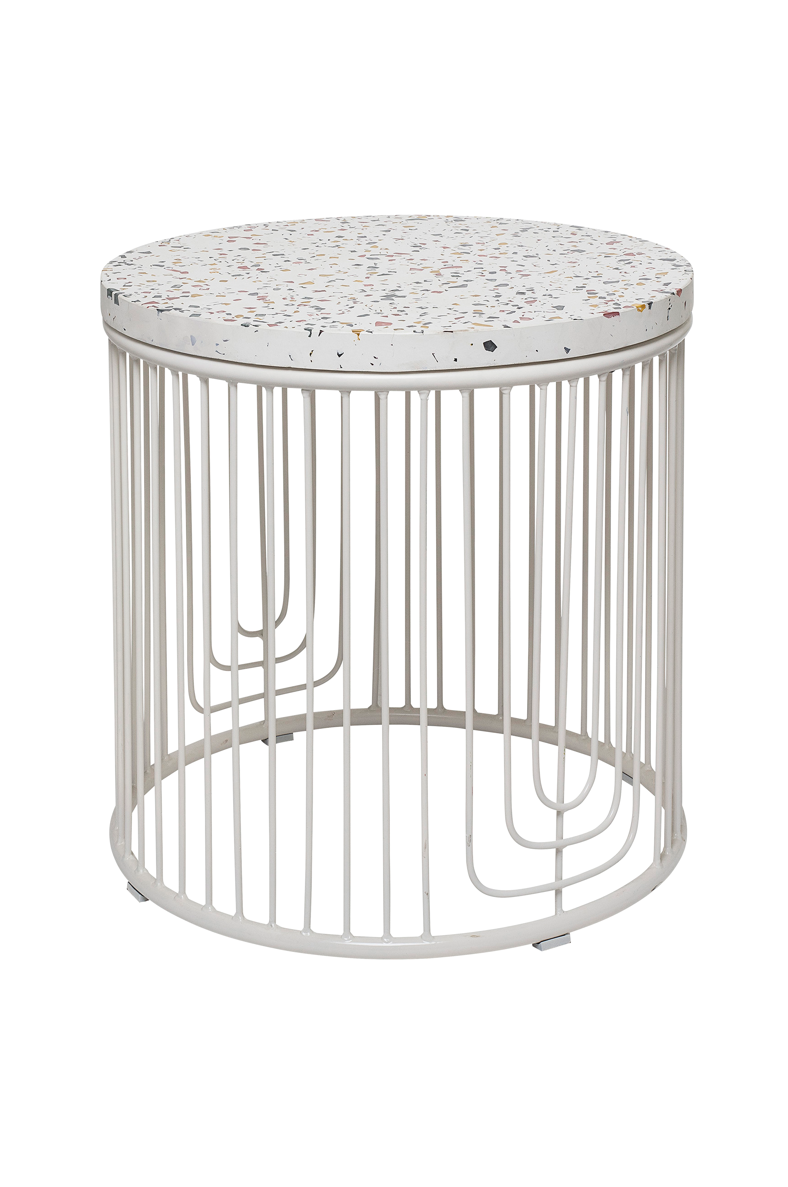 Sivupöytä, jossa kuviollinen betonilevy ja valkoinen metallijalusta. Ø 50 cm.