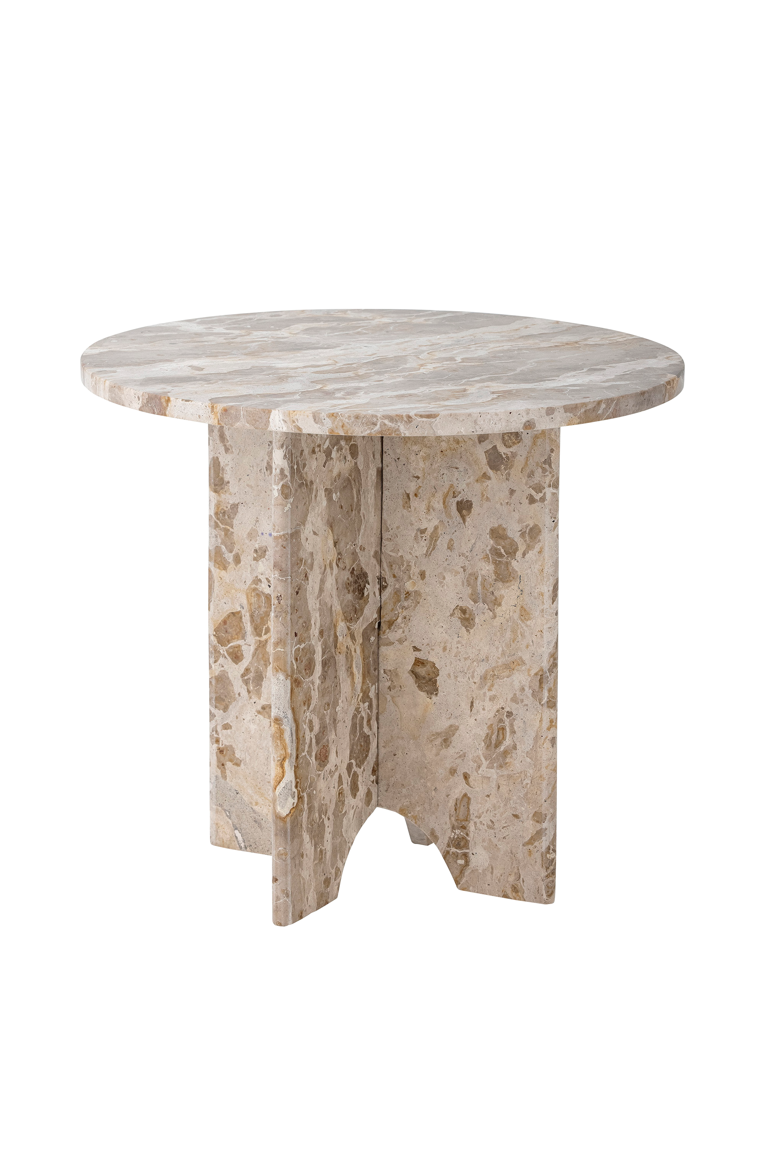 Bloomingvillen Jasmia-sivupöydässä on pelkistetty pohjoismainen muotoilu. Pöytä on ruskeaa marmoria ja siinä on pyöreä pöytälevy. Marmori on luonnonmateriaali, joten jokainen pöytä on ainutlaatuinen ja sävyt ja kuviot vaihtelevat.