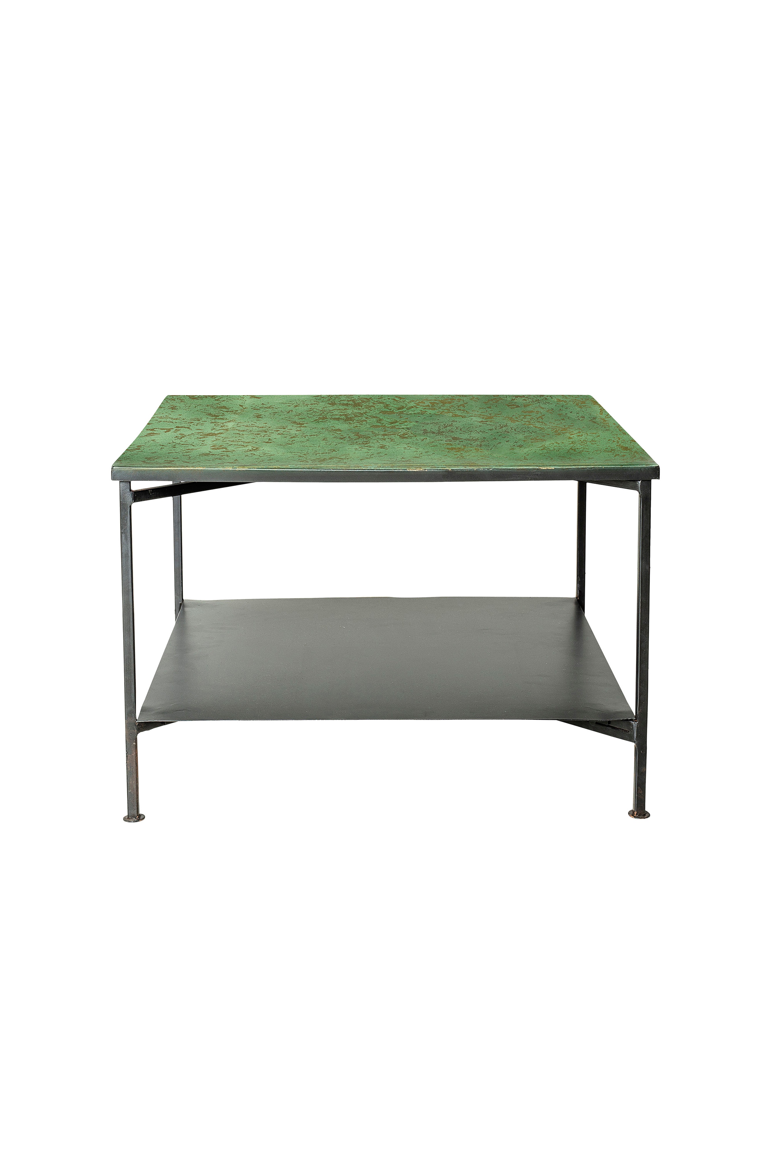 Sohvapöytä, jossa metallirunko ja vihreä pöytälevy. Toimitetaan osina.