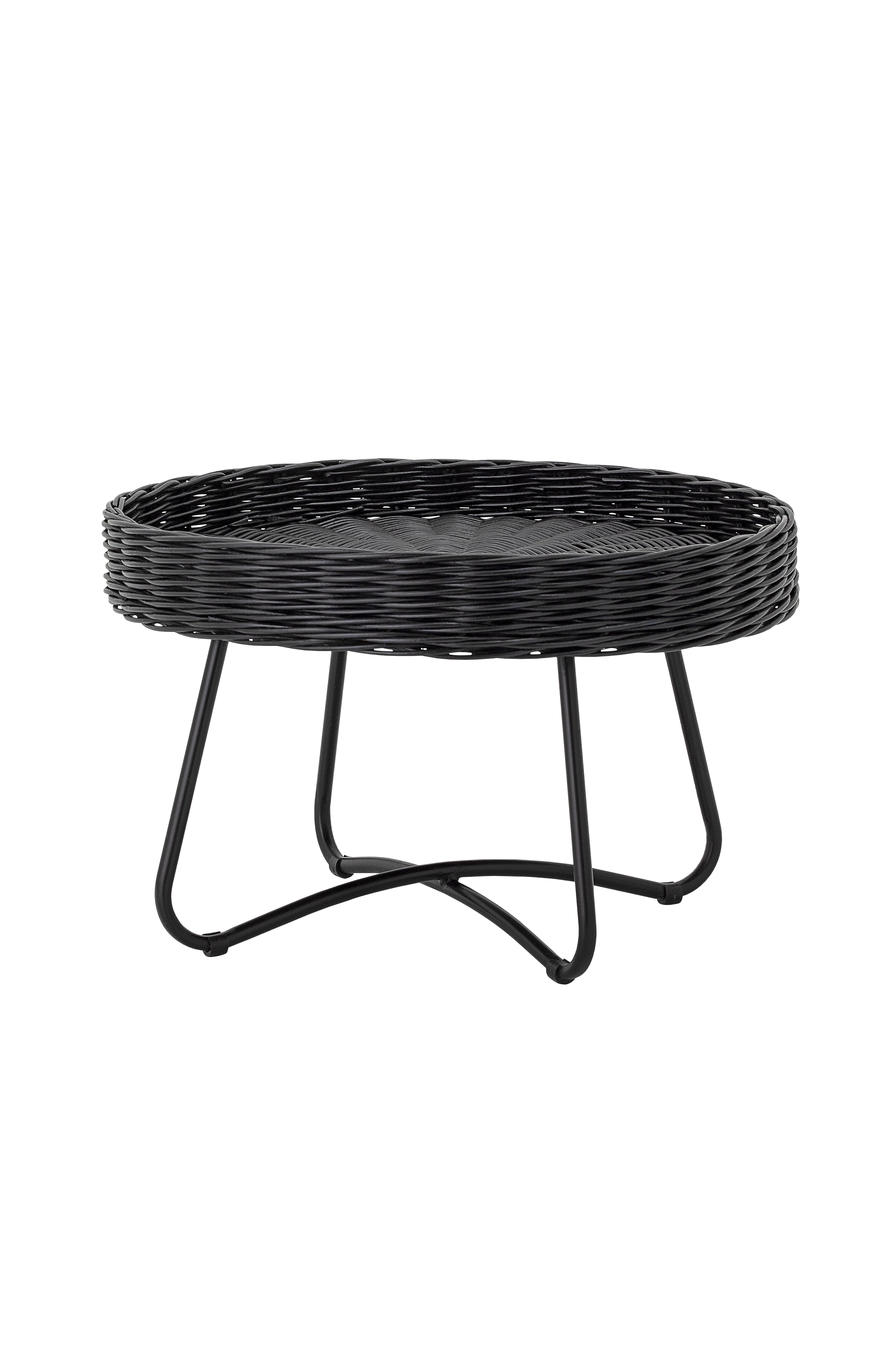 Sohvapöydän pöytälevy punottua rottinkia. Musta metallijalusta. Ø 60 cm.
