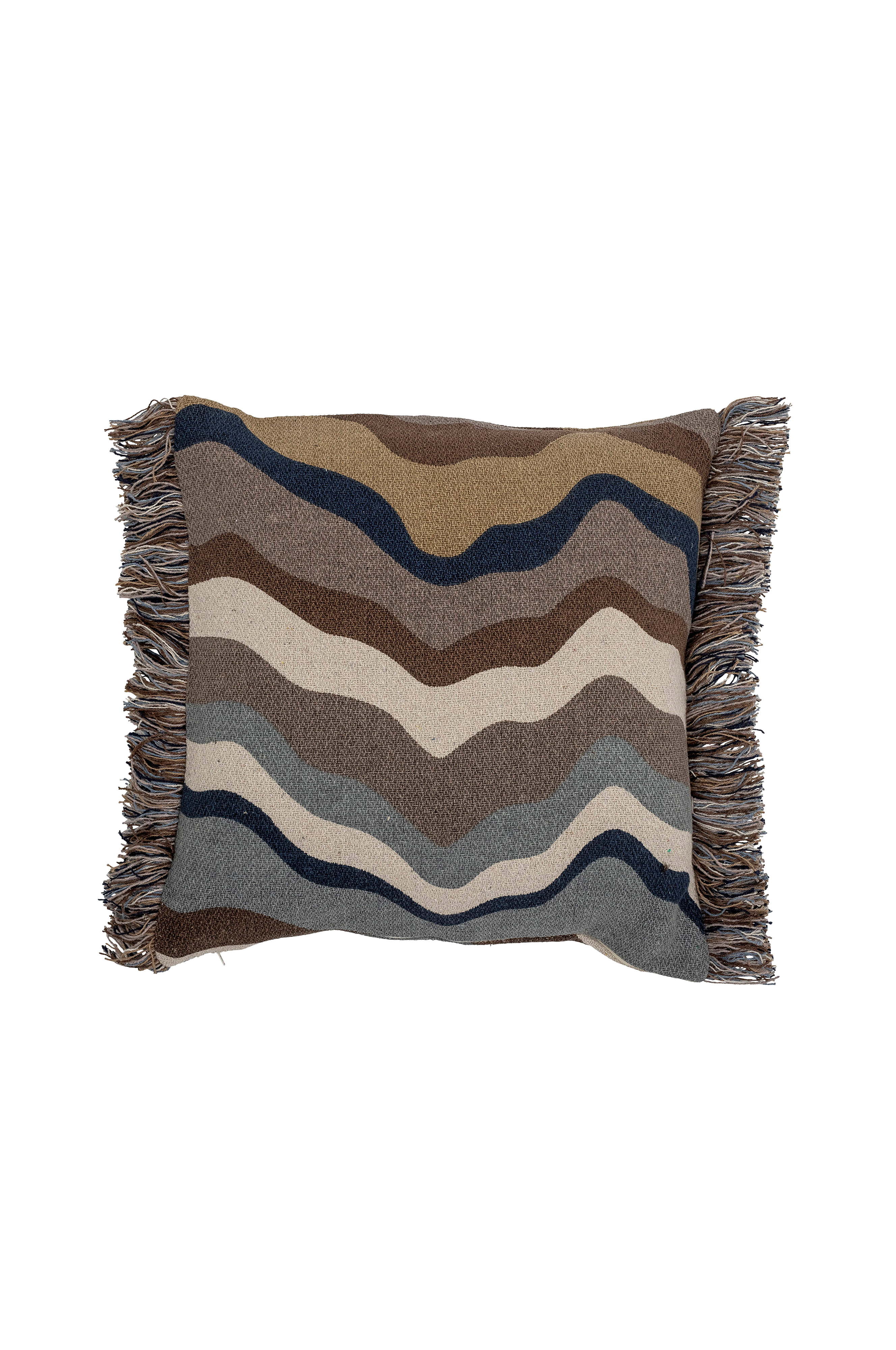Bloomingvillen Fatema-tyyny on kierrätyskangasta, jossa on ruskeat ja maanläheiset sävyt. Kankaassa on painatus, graafinen kuvio ja kauniit hapsut molemmissa päissä, mikä antaa huoneeseen kodikkaan ja persoonallisen tunnelman.