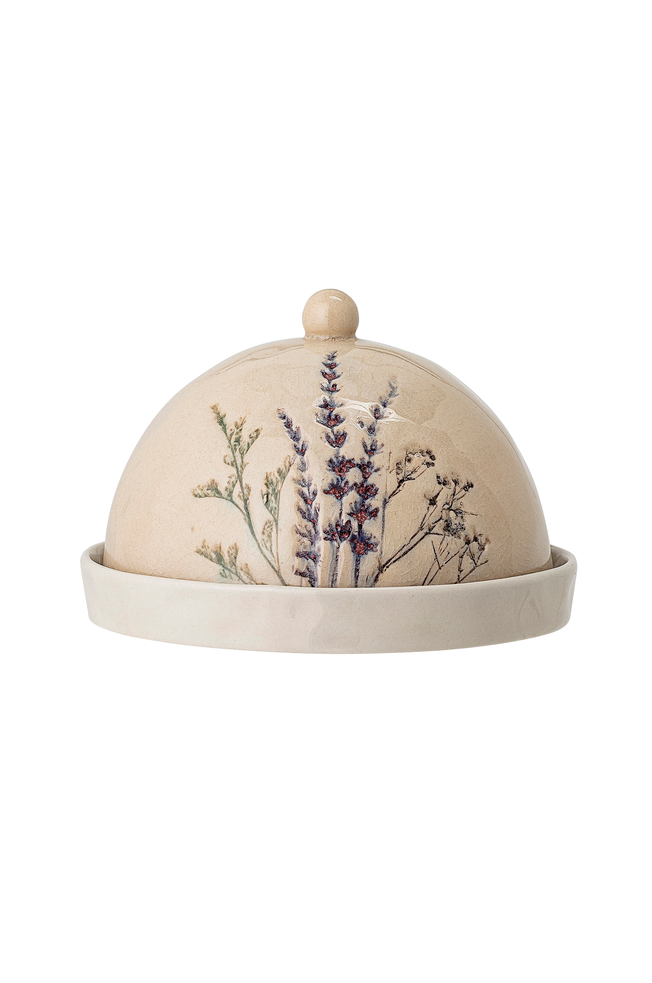 Bloomingvillen kaunis Bea-voikupu kivitavaraa, jossa on luonnolliset värit, krakeloitu lasite ja tyylikäs painettu kukkakuvio. Käytä voin, juuston tai muun elintarvikkeen säilytykseen jääkaapissa tai kauniina tarjottimena. Jokainen käsintehty kupu on ainutlaatuinen. Kestää konepesun.