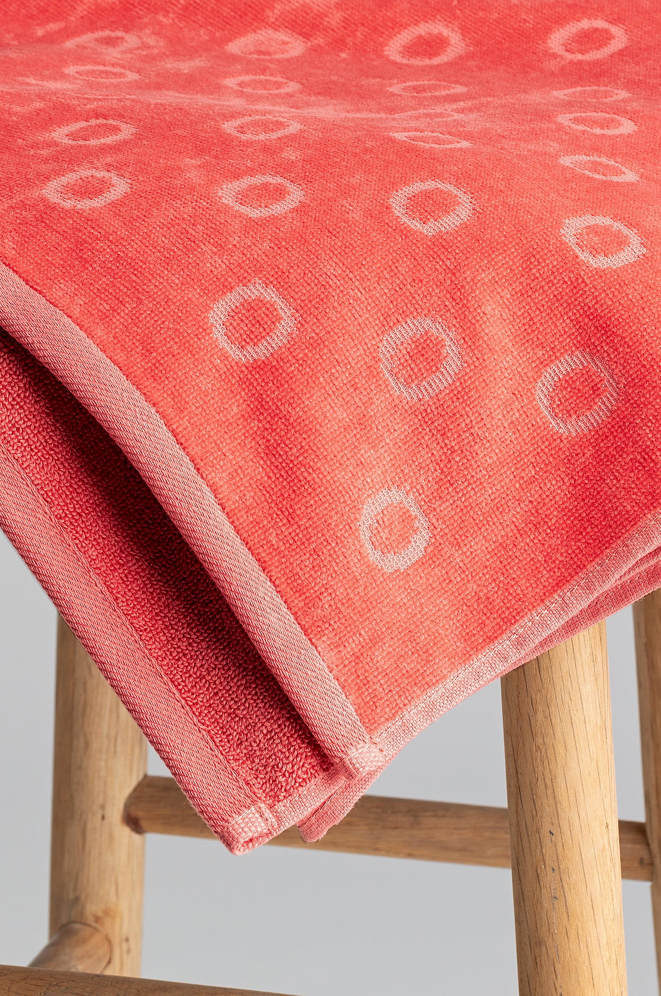 Pehmeästä veluurista valmistettu rantapyyhe 100% puuvillaa. Sopii täydellisesti rannalle tai kallioille. Kesäisen korallivärinen pyyhe, jossa edessä kaunis ympyräkuvio ja takana silmukkafroteeta. Koko 80x160 cm. Kylpypyyhkeessä on ripustuslenkit lyhyillä sivuilla. Oeko-Tex made in green. 100% puuvillaa