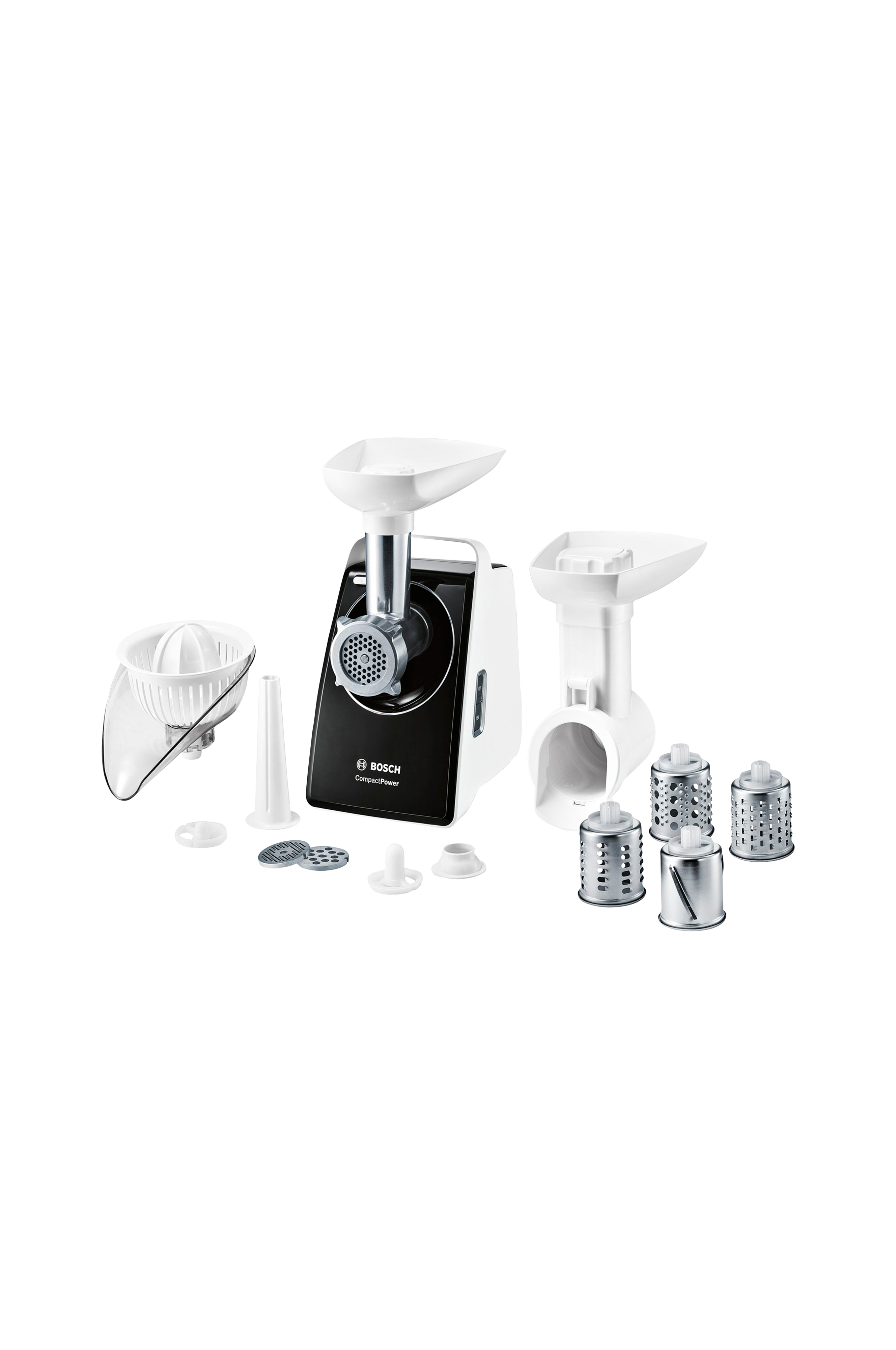 Musta Bosch CompactPower -lihamylly: tilaa säästävä ja monipuolinen monien lisävarusteiden ansiosta.