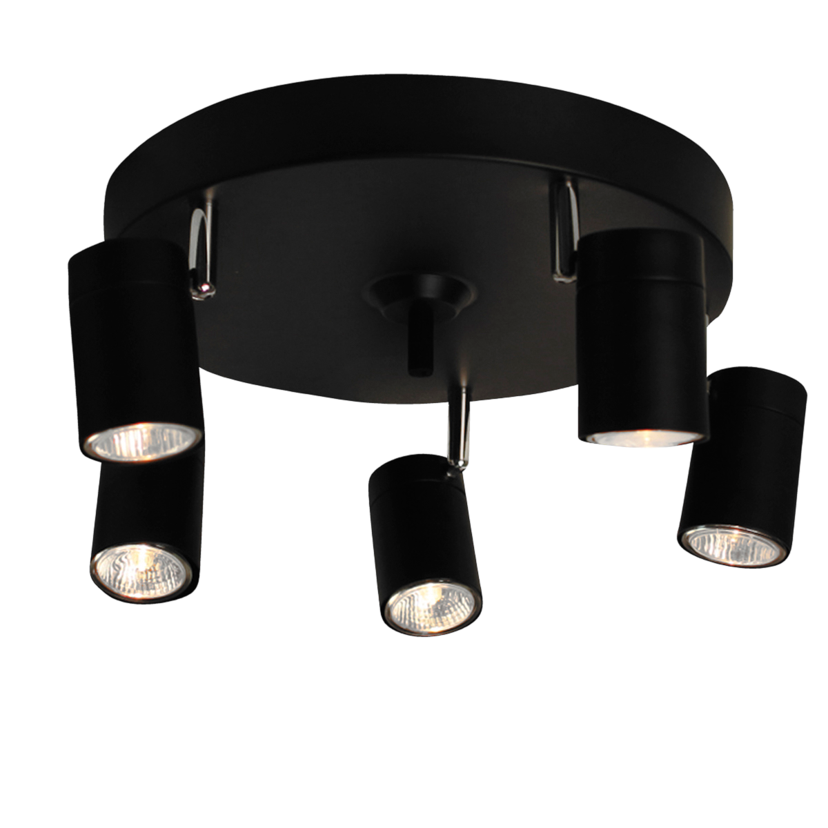 Correct spotlight 5 -kattovalaisin mustaa metallia. Ripustuskoukku. Korkeus 15 cm, halkaisija 30 cm. GU10 35Wx5, lamput eivät mukana.