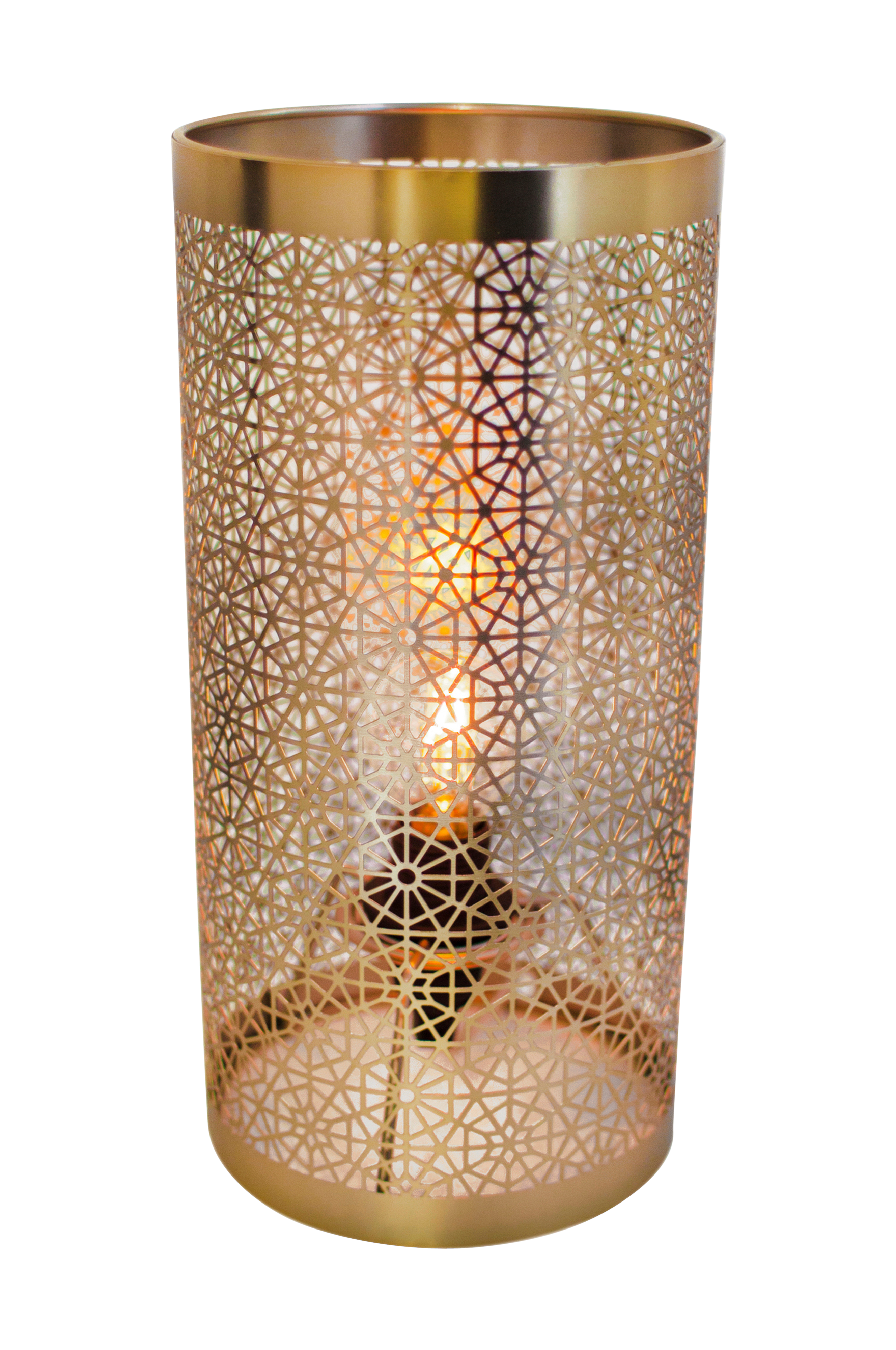 Hermine-pöytävalaisin metallia, jossa mattamessinginvärinen viimeistely. K: 28 cm, ø: 14 cm. E14, pieni lampunkanta. Enintään 40 W (lamppu ei ole mukana). 2-metrinen läpikuultava johto, jossa katkaisin.