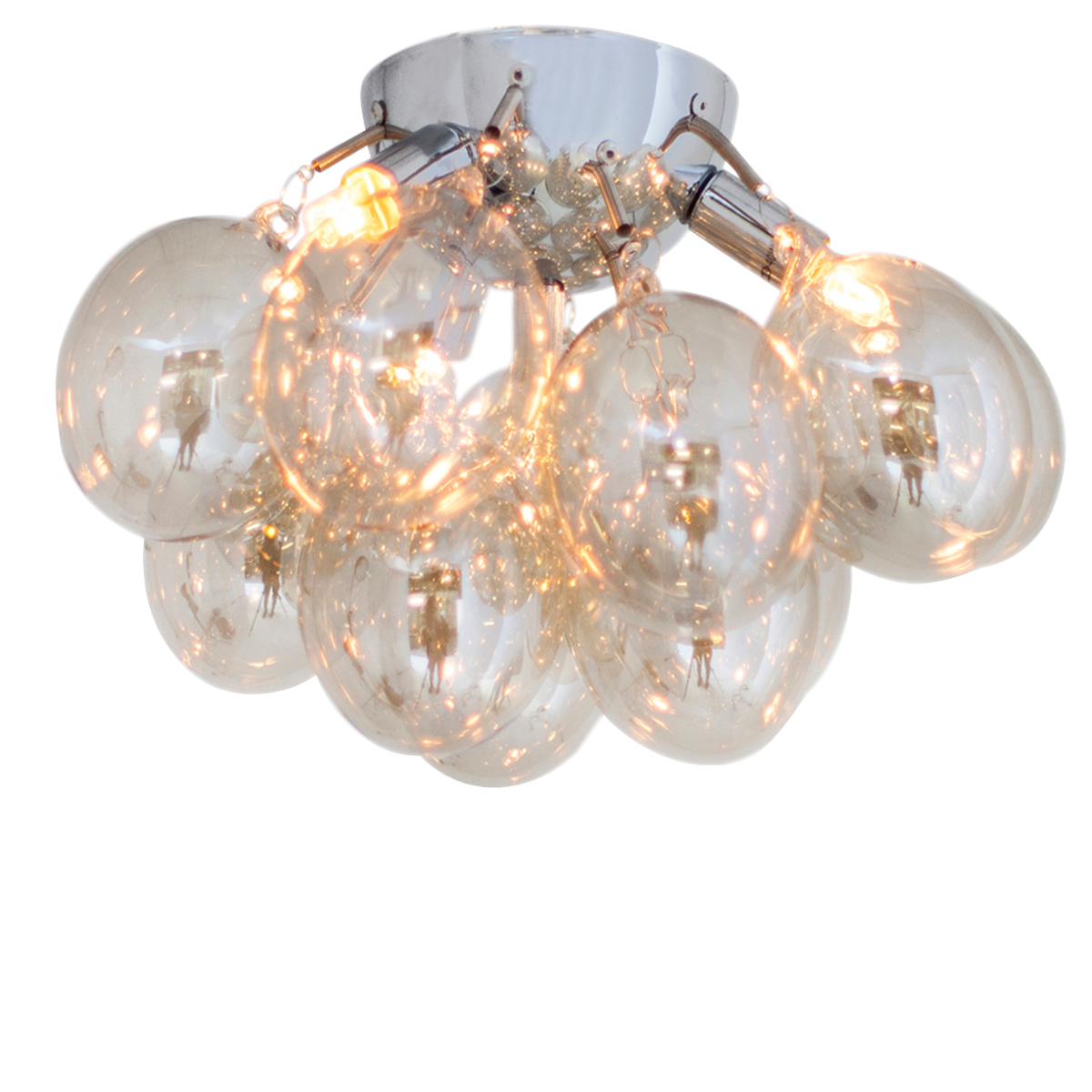 Gross-plafondi lasia. Krominvärinen kattokiinnike. 12 kpl meripihkanväristä lasia. Ripustuskoukku. Halkaisija 30 cm, korkeus 20 cm. G9, enintään 40 W x 3. Valonlähteet eivät sisälly toimitukseen.