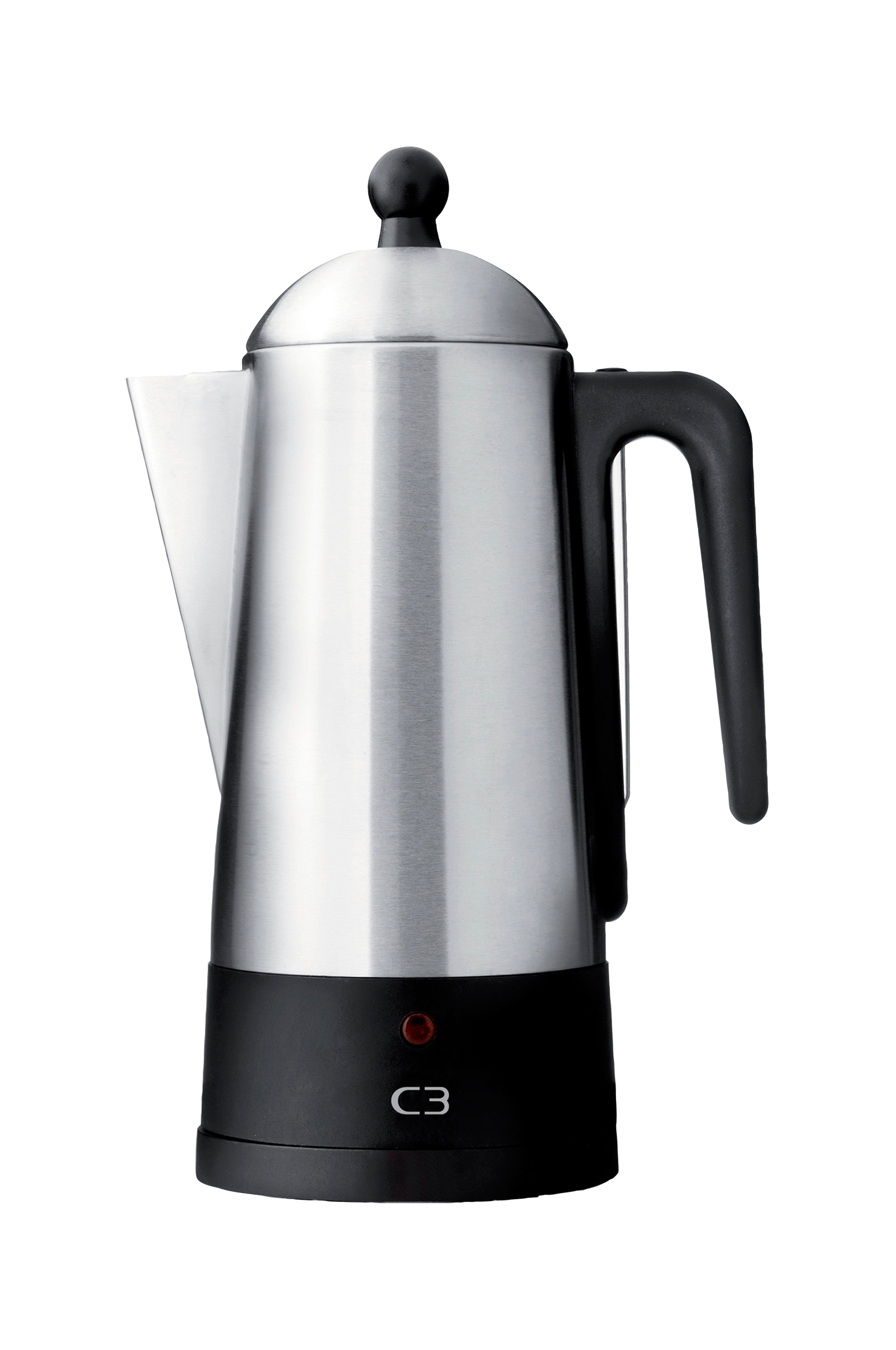 C3 Design -perkolaattori. Perkolaattorissa nyt myös automaattinen virrankatkaisu, joka on EU:n uuden ECO-direktiivin mukainen. Virta katkeaa 40 minuutin kuluttua käynnistämisestä. Kannun ominaisuuksien ansiosta kahvi pysyy sopivan kuumana vielä tunnin kuluttua virrankatkaisusta.