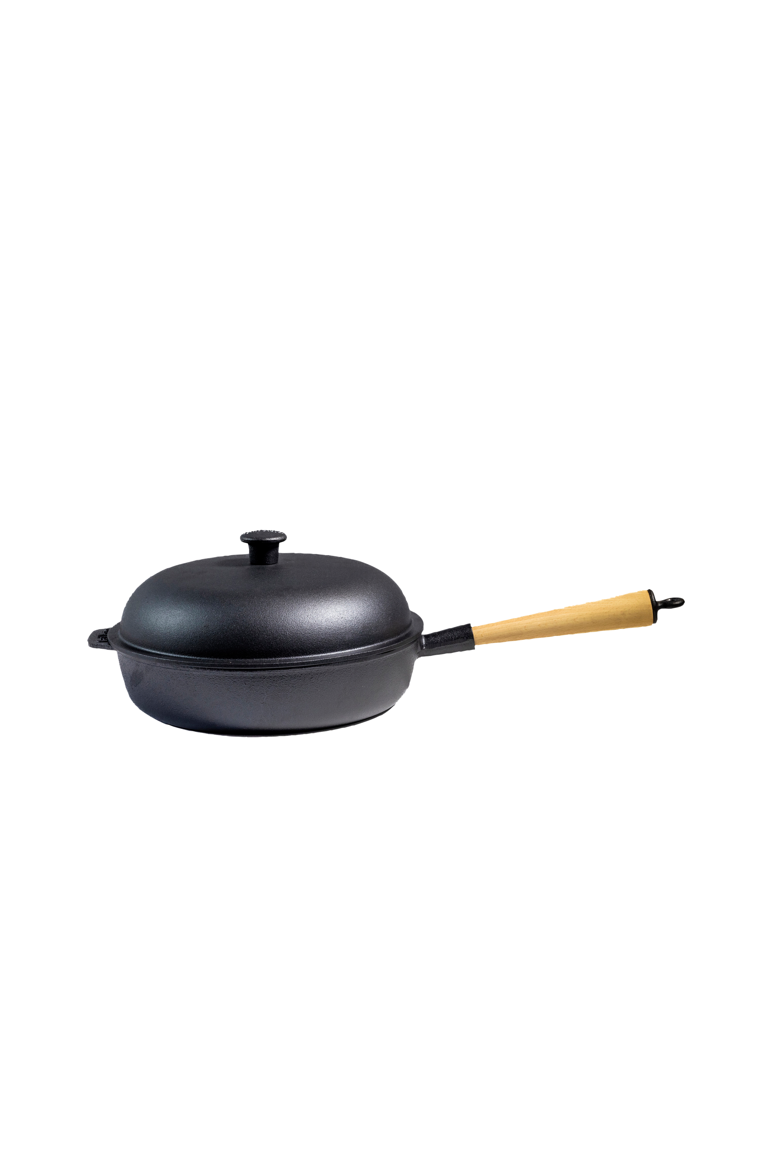 Carl Victorin valurautainen kannellinen haudutuspannu. Pannu jakaa lämmön erinomaisesti valuraudan hyvien lämpöominaisuuksien ansiosta, jolloin ruoka kypsyy tasaisesti. Carl Victorin valurautatuotteet on valmistettu tarkasti valvotusta, kierrätettävästä raudasta.