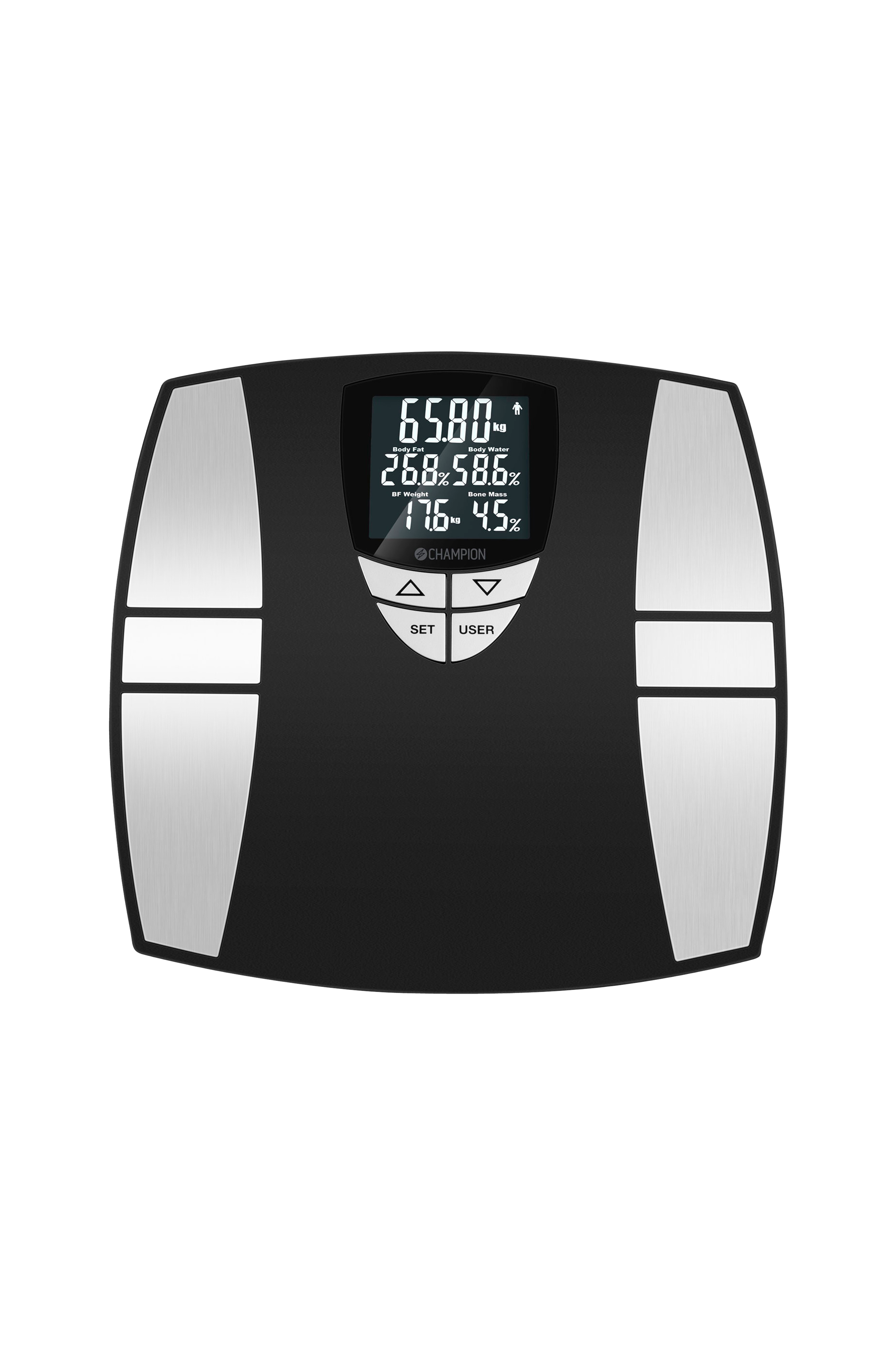 Championin Body Fat -henkilövaa'an avulla hallitset terveyttäsi - mittaat painon, kehon rasvapitoisuuden, vartalon veden määrän ja luiden painon. Toiminnallinen ja selkeä henkilövaaka, jossa erittäin suuri näyttö. Sisältää kaikki tarvittavat toiminnot, jotka antavat tietoja kehostasi. Tyylikäs muotoilu, mahdollisuus kahdeksalle eri käyttäjälle ja 200 kg:n enimmäiskuormitus sopii useimmille ihmisille. Mittauksen lopputulos on helppo lukea isosta näytöstä.