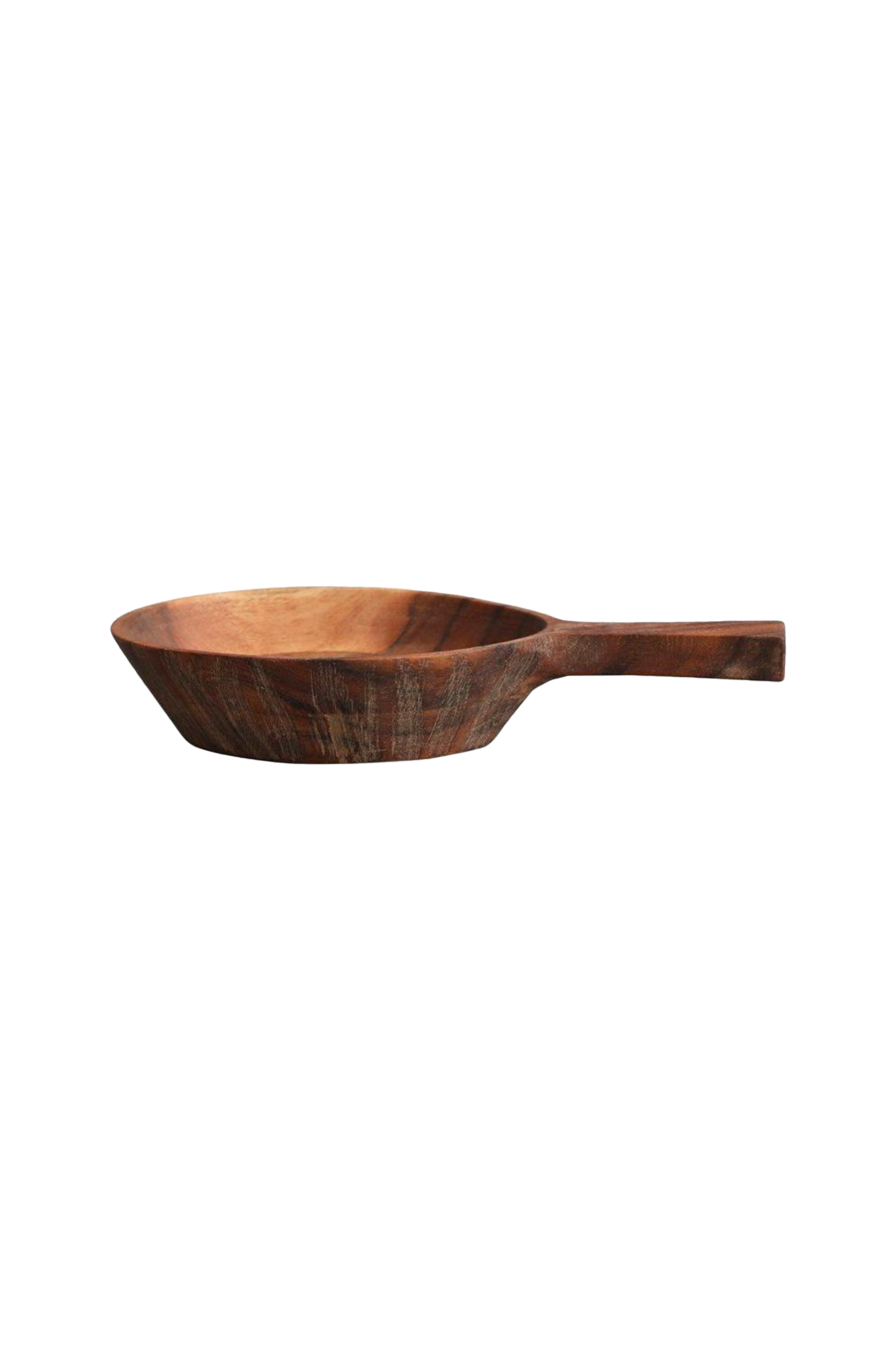 Kaunis akasiapuinen vati, jossa korkeat reunat ja kahva.