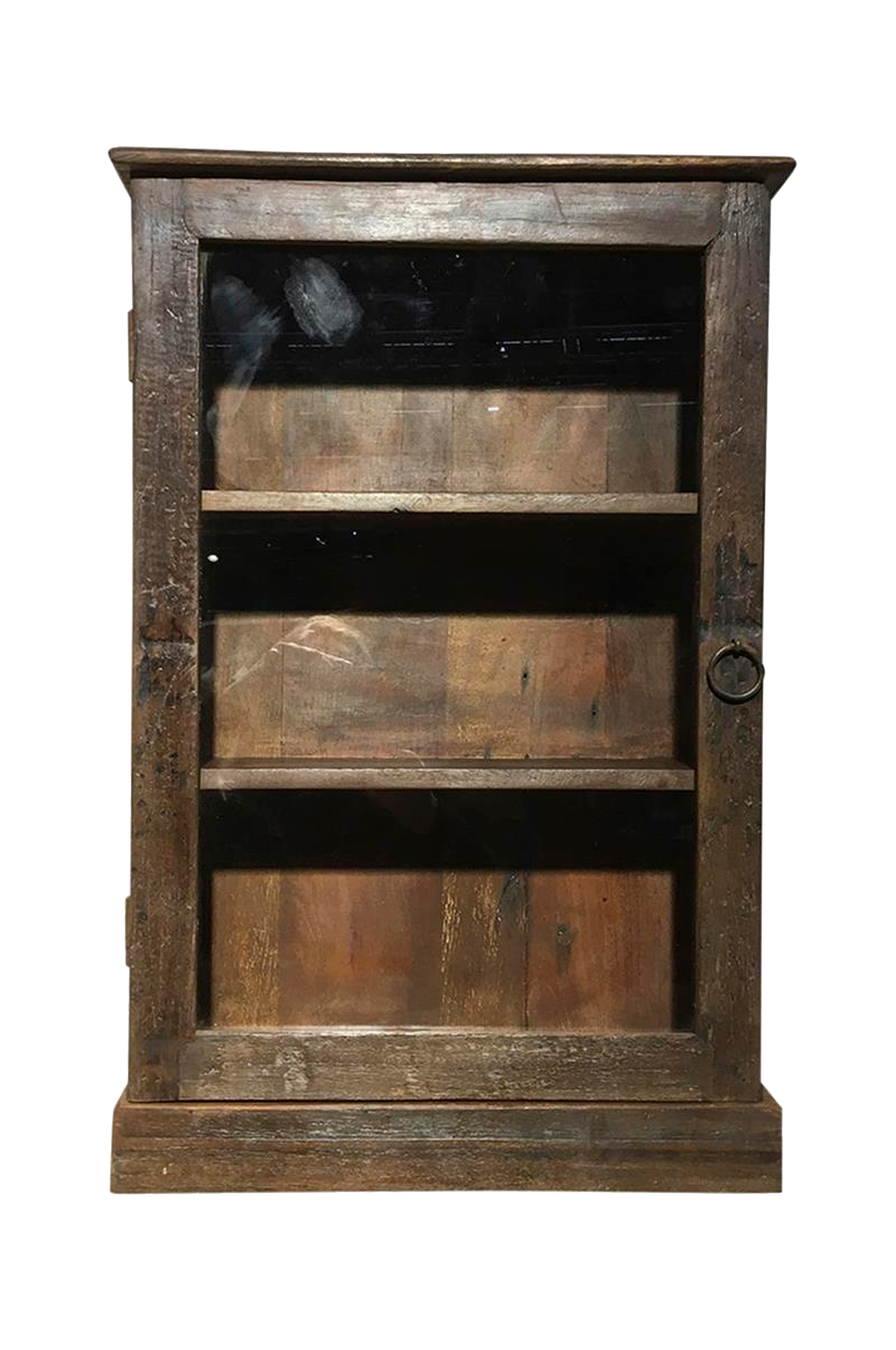 Miellyttävän rustiikin näköinen puukaappi vanhasta käytetystä puusta. Kaapissa on kaksi hyllyä ja lasiovi.