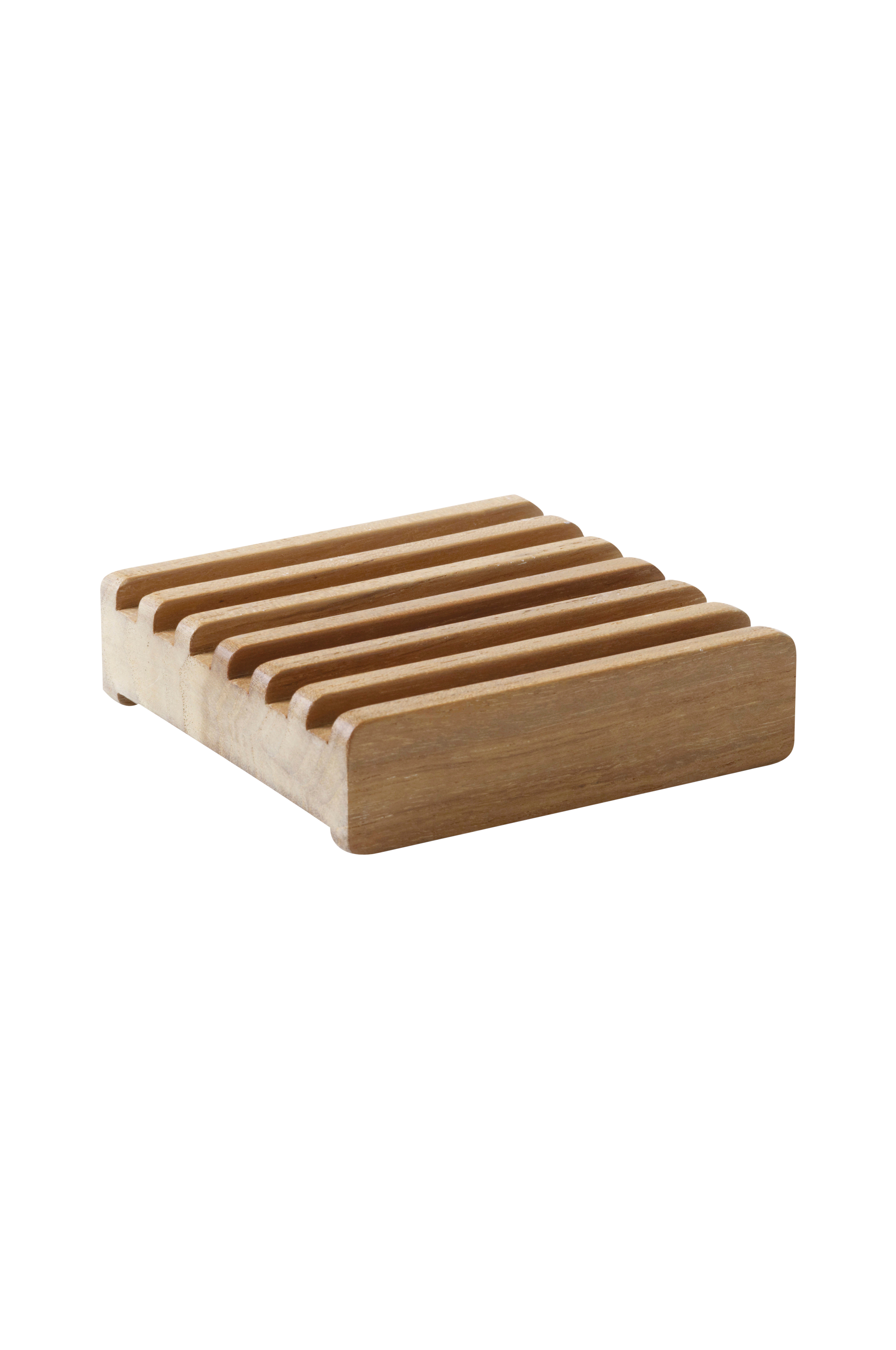 Pelkistetyn kaunis saippuateline. Auttaa saippuaa tuulettumaan ja kuivumaan. Teline on tiikkipuuta, joka sopii hyvin kosteisiin tiloihin.