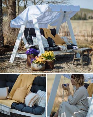 Clara kehottaa yhdistämään vanhaa ja uutta luodaksesi persoonallisen ilmeen ulkotilaan. Uudessa puutarhasohvassa voi olla käytettyjä tyynyjä tai siihen voi yhdistää vanhan kirpputorilta löydetyn pöydän. Clara suosittelee myös luomaan useita ulkotiloja, jos siihen on mahdollisuus. Aurinko liikkuu päivän aikana, joten viileänä päivänä haluat ehkä vaihtaa paikkaa auringon mukaan, ja kuumana päivänä siirtyä ihanan varjoisaan tilaan. Tärkeintä on sisustaa ulkotila rohkealla asenteella. Uskalla heittäytyä! Valitse jykeviä, isoja ruukkuja. Valitse korkeita kesäkukkia. Älä tyydy vain yhteen värikkääseen tyynyyn, vaan asettele puutarhakeinuun viisi tyynyä ja voit tehdä olosi aina mukavaksi! Muista, että ulkotilassa on hyvä olla jonkinlainen katto. Sen ei tarvitse olla täysin sateelta suojaava, mutta jokin huoneen tuntua korostava olisi hauska. Aurinkovarjo, puun latvus, pergola – tai vaikkapa säleikkö, jossa kiipeilee köynnöskasveja?